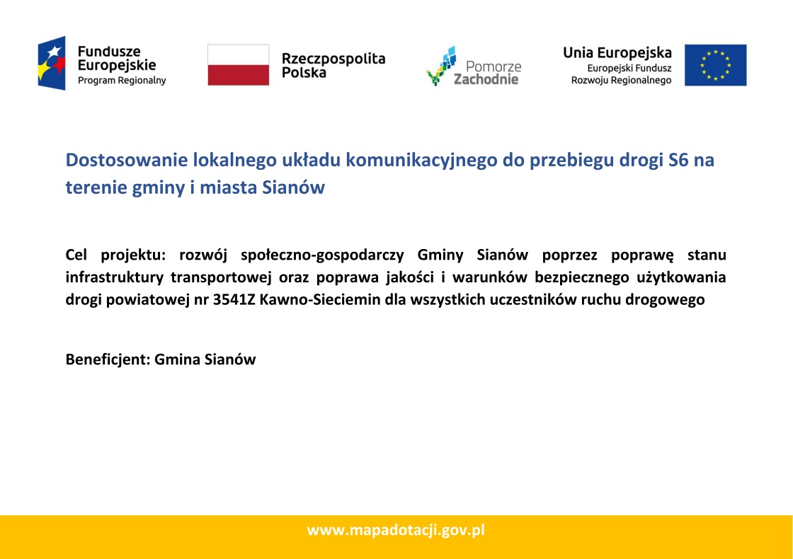 W ostatnich dniach ruszyła długo oczekiwana przebudowa drogi powiatowej nr 3541Z Kawno- Sieciemin w ramach projektu pn. „Dostosowanie lokalnego układu komunikacyjnego do przebiegu drogi S6 na terenie gminy i miasta Sianów”, realizowanego w ramach Działania 5.3 Budowa i przebudowa dróg lokalnych (gminnych i powiatowych) w ramach Strategii ZIT dla Koszalińsko-Kołobrzesko-Białogardzkiego Obszaru Funkcjonalnego Regionalnego Programu Operacyjnego Województwa Zachodniopomorskiego 2014-2020.