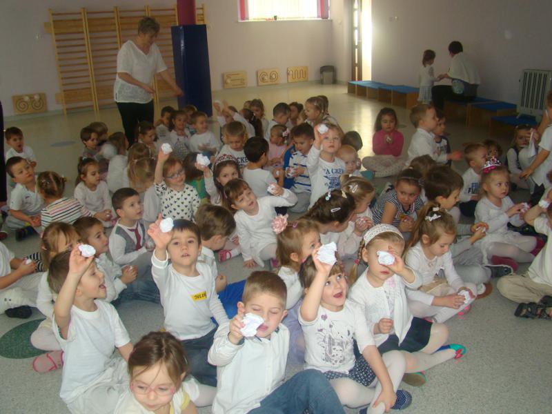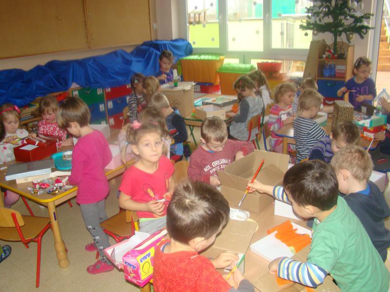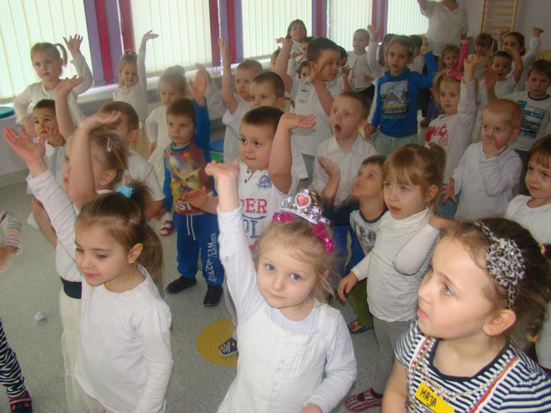 W Przedszkolu i Żłobku każdy dzień ferii był dla dzieci wielką niespodzianką i przygodą. Atrakcją nie było końca. Dzieci przeniosły się do Krainy Życzliwości, gdzie bawiły się w zabawy integracyjne, poznawały bliżej inne dzieci, przygotowywały dla przyjaciół życzliwe prezenty, każdego obdarowywały dobrocią, życzliwością i uśmiechem. Innego dnia dzieci przebywały w Krainie Bajki i odwiedziła je Wróżka Basia. Baśniowy Gość opowiadał bajki, czarował, wymyślał bajkowe zagadki i rebusy, bawił się w bajkowe zabawy muzyczne. Dzieci odwiedziły również Krainę Matematyki, która zaczarowała las. Rozwiązując zadania matematyczne przedszkolaki odczarowały „Zielonego Przyjaciela Ludzi” i mogły do niego wrócić leśne zwierzęta. Dzieci odbyły podróż autobusowym wehikułem do Krainy Pluszaków. Poznały w niej Łosia Ktosia, Żyrafę Mariannę i Misia Uszatka, które były ich przewodnikami po fabryce zabawek. Żłobkowicze w tym samym czasie przeniosły się do Misiowej Doliny, gdzie bawiły się z Kubusiem Puchatkiem. Dzieci odbyły wyprawę do Filmowej Krainy, gdzie oglądały bajki wyświetlane przez Czarnoksiężnika Andrzeja i Wróżbitę Tomasza. Gwoździem feryjnych podróży był Dzień bez zabawek, podczas którego dzieci same projektowały zabawki, wymyślały własne zabawy. Feryjni podróżnicy musieli wykazać się sprawnością fizyczną podczas Mistrzostw Sportowych. Skakały, czołgały się, wspinały się, z wielkim sportowym zaangażowaniem wykonywały ćwiczenia gimnastyczne. Dzieci zamieniły się w kucharzy i przeniosły do Kuchcikowa. Przygotowały wiele pysznych potraw: gofry z bitą śmietaną i owocami, koktajl owocowy, smakowite babeczki, czekoladowe mufinki, sałatki owocowe, kisielowe fantazje, ciasteczka cynamonowe. W Kuchcikowie brzuszki łakomczuszki były bardzo szczęśliwe. Przedszkolaki i żłobkowe maluch odwiedziły Białą Krainę, w której uczestniczyły w dyskotekowej zabawie bez śniegu. Podczas „Ferii z pomysłem” dzieci przedszkolne i żłobkowe cudownie się bawiły, zapominając o braku śniegowej pierzynki na świecie.