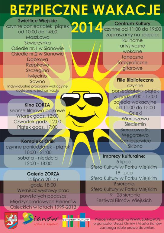Zapraszamy na zajęcia wakacyjne dla dzieci i młodzieży organizowane przez Centrum Kultury i Bibliotekę Publiczną Gminy i Miasta Sianów. Uczestnicy mają do wyboru zajęcia kulinarne, artystyczne, wokalne, taneczne, teatralne, fotograficzne oraz gitarowe. Wstęp na zajęcia jest wolny pod warunkiem złożenia deklaracji. Warsztaty odbywają się codziennie w godzinach od 11 do 19 zgodnie z grafikiem. Jest to jedna z form spędzenia wakacji w Gminie Sianów, oprócz tego własne zajęcia organizują poszczególne filie biblioteczne i świetlice wiejskie. Dzieci będą mogły skorzystać również z seansów filmowych w kinie "Zorza" w Sianowie wyświetlanych we wtorki i czwartki o godzinie 12 oraz w piątki o godzinie 17.
