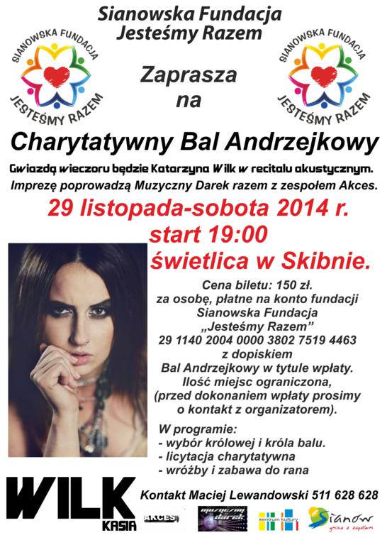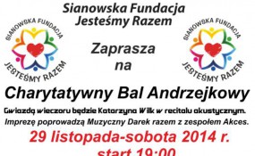 Serdecznie przypominamy, iż sianowska Fundacja "Jesteśmy Razem" zaprasza na Charytatywny Bal Andrzejkowy. 29 listopada start o godz. 19:00  świetlica w Skibnie. Gwiazdą wieczoru będzie Katarzyna Wilk w recitalu akustycznym. Imprezę poprowadzą Muzyczny Darek razem z zespołem Akces.