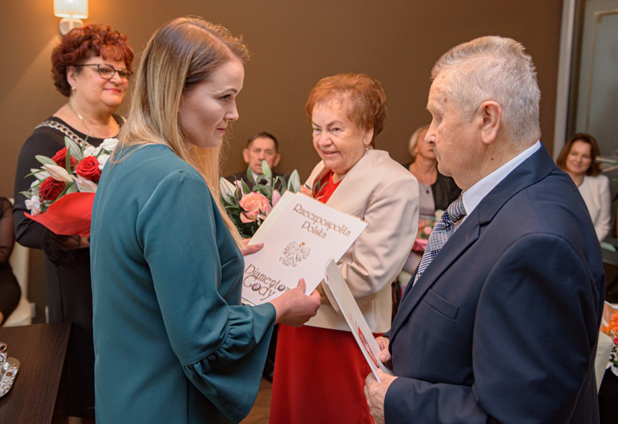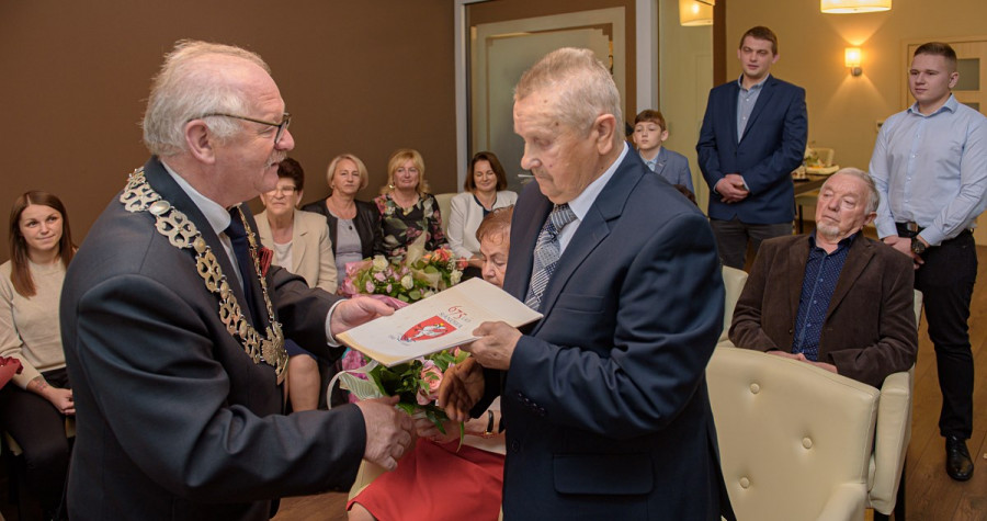 Przewodniczący Rady Miejskiej Janusz Machała wręczył parze małżeńskiej okolicznościowe dyplomy, upominki, piękne kwiaty oraz złożył moc serdecznych życzeń.
