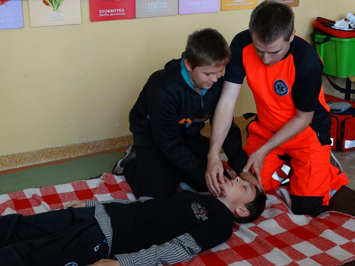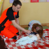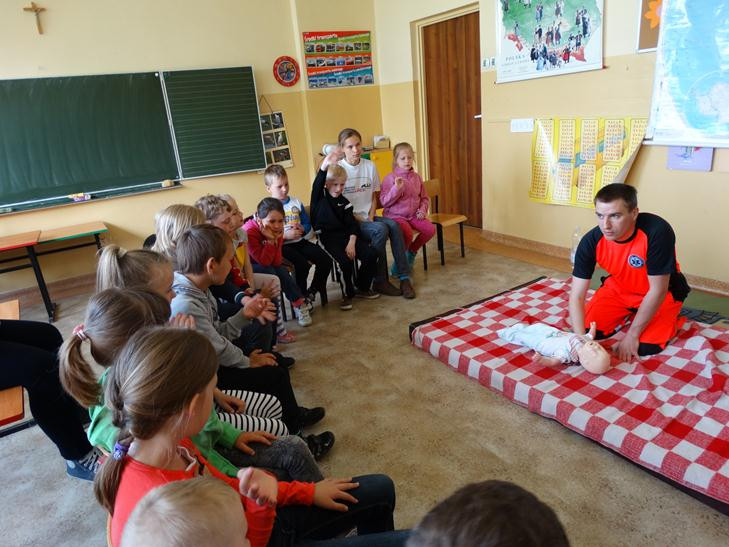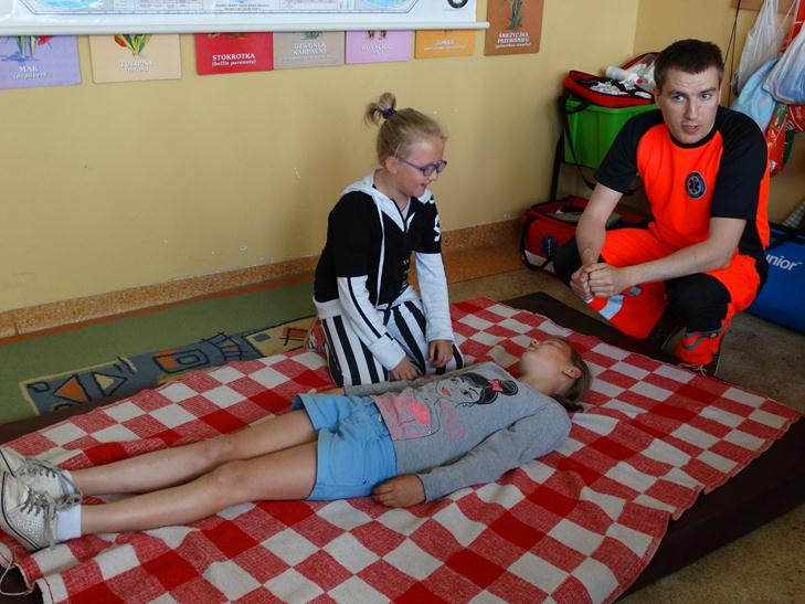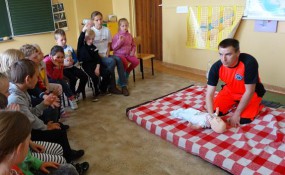 Jak prawidłowo przeprowadzić pierwszą pomoc przedmedyczną przedstawił wszystkim ratownik medyczny Marcin Plonder. Dzieci trenowały ułożenie „poszkodowanego” w pozycji bezpiecznej, a także wzywały pogotowie ratunkowe pamiętając, aby podać wszystkie ważne informacje.
