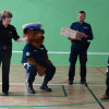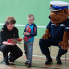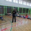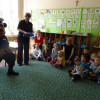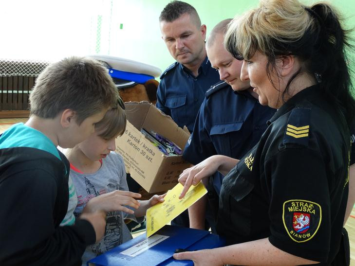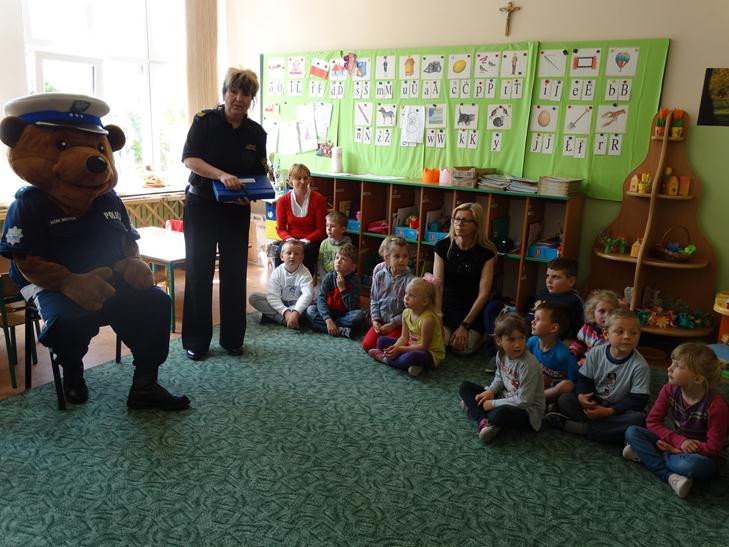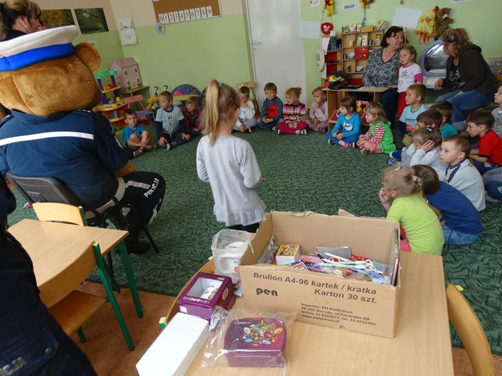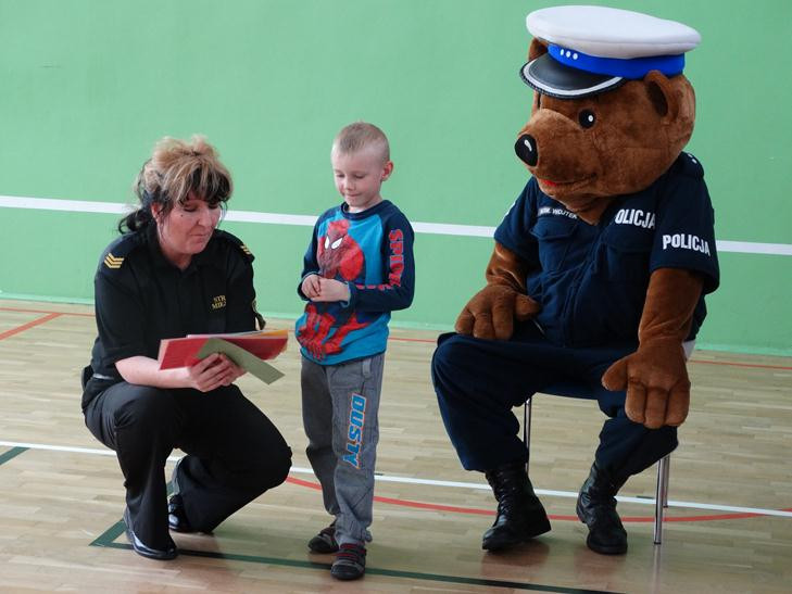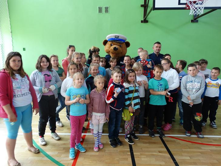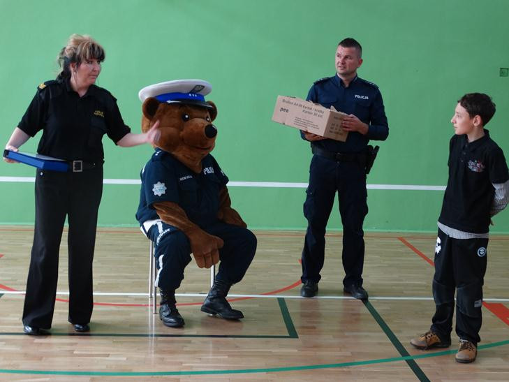 O bezpieczeństwie w ruchu drogowym mówiła przedstawicielka straży miejskiej starszy specjalista Beata Bodys oraz policjanci asp. Marek Lisiecki i mł. asp. Tomasz Bojarowicz. Wspierał ich komisarz Wojtek – olbrzymia policyjna maskotka. Nasi uczniowie wykazali się dużą wiedzą z zakresu kodeksu drogowego , w związku z tym wszyscy dostali upominki.