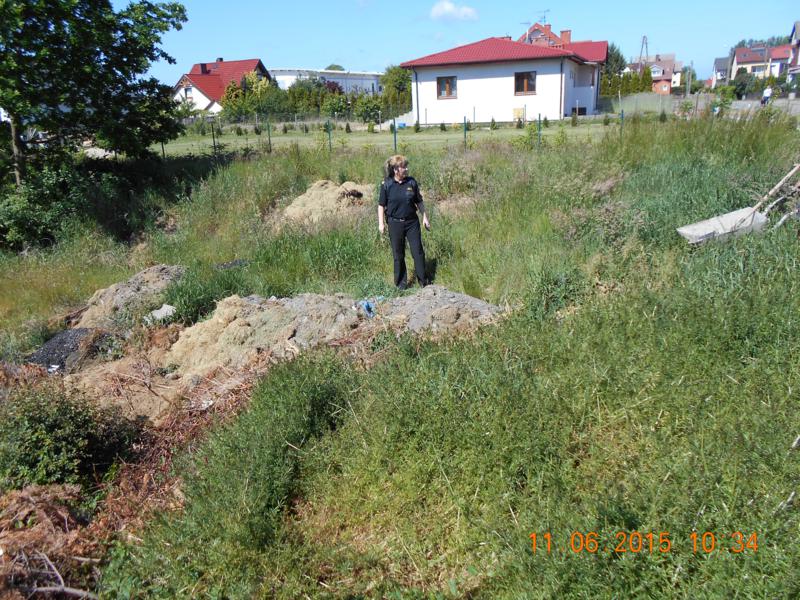 W dniu 11.06.2015 roku mieszkaniec  Sianowa zgłosił  do Straży Miejskiej iż na jego prywatną posesję ktoś wywozi taczką  gruz i ziemię.  Udano się na miejsce gdzie na terenie wskazanej posesji, znajduje się wykop pod fundament, w którym powstało wysypisko śmieci. Na miejscu podjęto odpowiednie czynności służbowe. Ustalono osobę, która w dniu dzisiejszym wysypała do wykopu gruz z ziemią. Wdrożono postępowanie mandatowe. Polecono uprzątniecie wysypanych śmieci. Pouczono o regulaminie   w sprawie utrzymania czystości i porządku na terenie Gminy i Miasta w Sianowie, który nakłada na mieszkańców segregację odpadów.