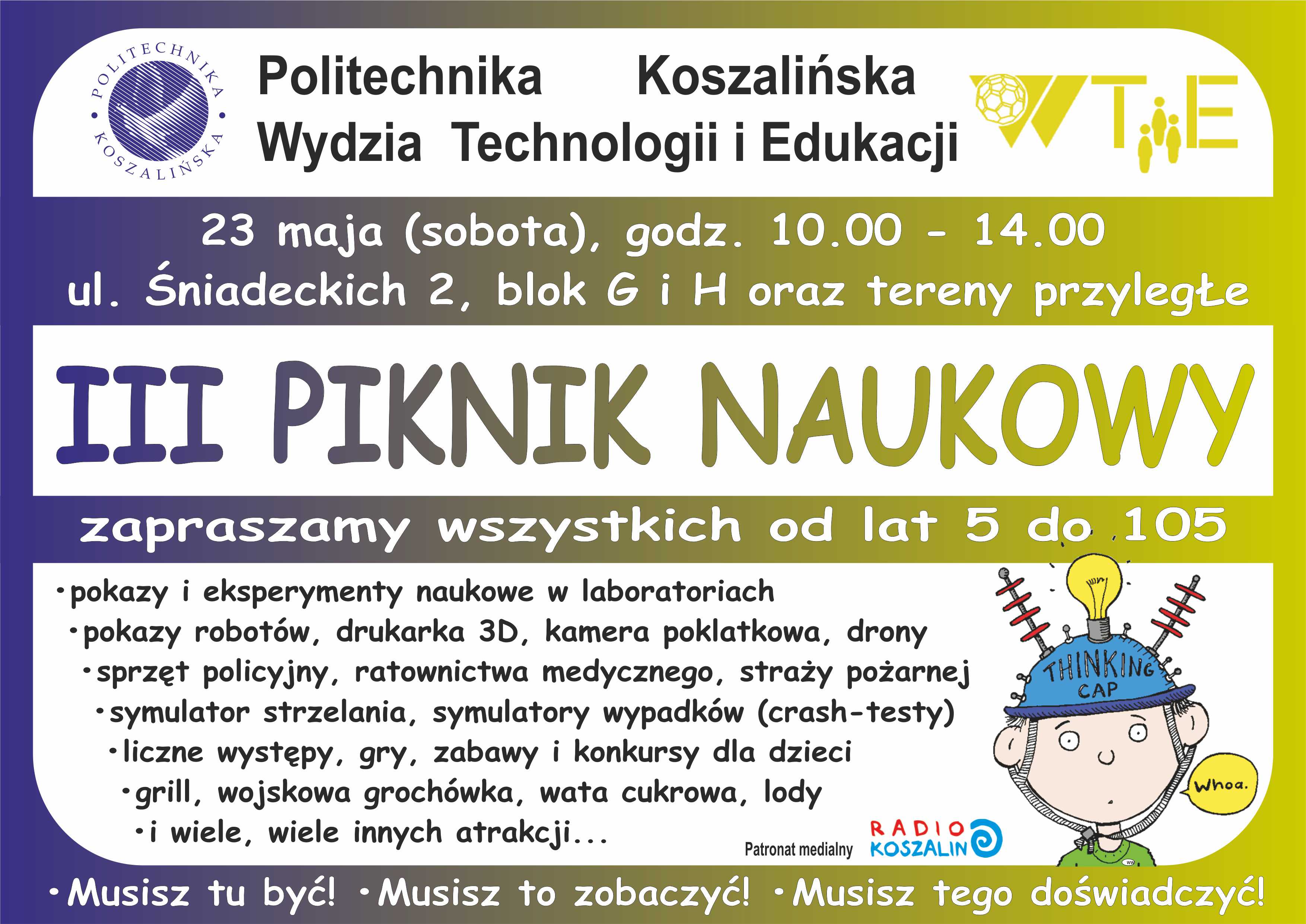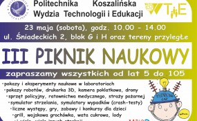 W dniu 23 maja, w godz. 10-14, w kampusie przy ul. Śniadeckich 2 Politechniki Koszalińskiej, w budynkach G i H oraz na terenach przyległych odbędzie się III Piknik Naukowy organizowany przez Wydział Technologii i Edukacji. Piknik adresowany jest do szerokiego kręgu mieszkańców Koszalina i okolic, organizatorzy zapraszają wszystkich bez względu na wiek. W programie zaplanowano liczne pokazy i eksperymenty naukowe w laboratoriach Wydziału, w których każdy będzie mógł wziąć aktywny udział. Można będzie m.in. dowiedzieć się jak są zbudowane i jak działają kolektory słoneczne, kamera termowizyjna i poklatkowa czy też drukarka 3D, zobaczyć pokaz robotów przemysłowych i mobilnych, inteligentnych systemów sterowania, a także latających dronów. Ponadto, przekonać się, że fizyka wcale nie musi być trudna i nudna, a dzięki chemii można wystrzelić nawet i z kurzej wątróbki…