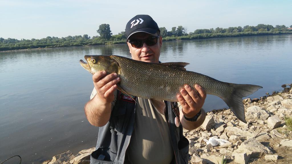 Relacja Piotra Piechockiego z Ogólnopolskich Zawodów Spinningowych o “Puchar Wisły: w Wyszogrodzie. W dniu 05-07 2015 odbyły się wysokiej rangi Ogólnopolskie Zawody Spinningowe o “Puchar Wisły” w Wyszogrodzie. Obsada znakomita-ponad 60 zawodników i mimo ciężkich warunków pogodowych przed jedenastą 35 st. w cieniu-zawodnicy o szóstej trzydzieści rozpoczęli łowienie. Po wcześniejszym rozeznaniu terenu obrałem stanowisko naprzeciwko organizatora. Po co gonić daleko na główki  jak pod nosem widać baraszkujące  ryby. Tym sposobem nie tracąc zbędnego czasu rozpoczynam łowienie na Wiśle na dwie wędki. Jedną jaziówkę a drugą boleniówkę. Taki wyjazd w dwie strony prawie 800km-wymaga nad łowiskiem uniwersalności odnośnie połowu danych gatunków ryb. Po  pół godzinie łowiąc na jaziówkę wreszcie, przepływa duża motorówka . Na kamieniach spora fala-na to czekałem i po jej ustąpieniu widzę atakującego bolenia z brzegu. Natychmiast obchodzę stanowisko po trzcinach, biorę boleniówkę podchodzę bolenia  od ogona. Skradając się  do miejsca baraszkowania rybska  wykonują z pięć rzutów wachlarzowatych. Za piątym widzę jak boleń startuje do woblera i branie. Ryba się zapina. Myślałem, że to osiemdziesiątka, omijam małe rozlewisko. Dynamika wspaniała. Ponad 50m. hol za rybą i jak się okazało boleń nie trafił w paszczę, ale w ataku zapiął się za płetwę grzbietową/atakując drobnicę potrafi nawet bić ogonem. Boleń wreszcie złowiony /70.4cm/, ale zgłoszony sędziemu, że zapiął się z płetwę grzbietową tak trafił co jest nie zgodne z regulaminem zawodów. Rybę  puszczam. Gdyby wziął  w okolicach głowy wszystkie triumfy pojechały by do Sianowa. Na zakończenie zawodów w  nagrodę dostaję  super oklaski od startujących z okazji przyznania nagrody Fair Play za puszczenie ryby. Super impreza mimo pogody. Gorąco polecam. Piotr Piechocki - Sianów.