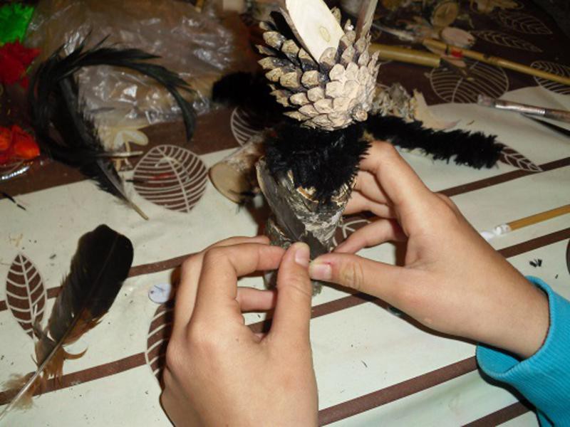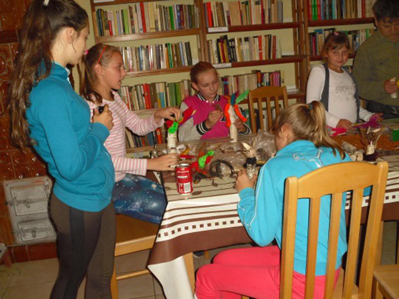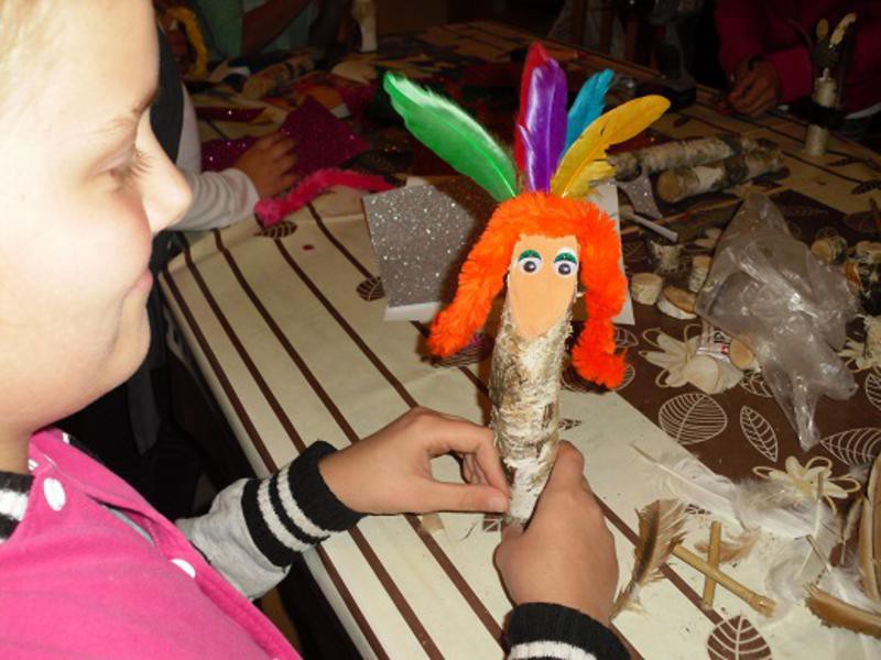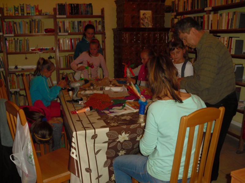 Na zajęciach plastycznych prowadzonych pod okiem pana Adama Maciejewskiego w Filii Bibliotecznej w Węgorzewie powstały kolorowe stworki-potworki. Do ich wykonania dzieci wykorzystały kolorowe pióra, szmatki, wycinanki, szyszki oraz z kawałki drewna. Powstałe stworki zamieszkały na półce w bibliotece.