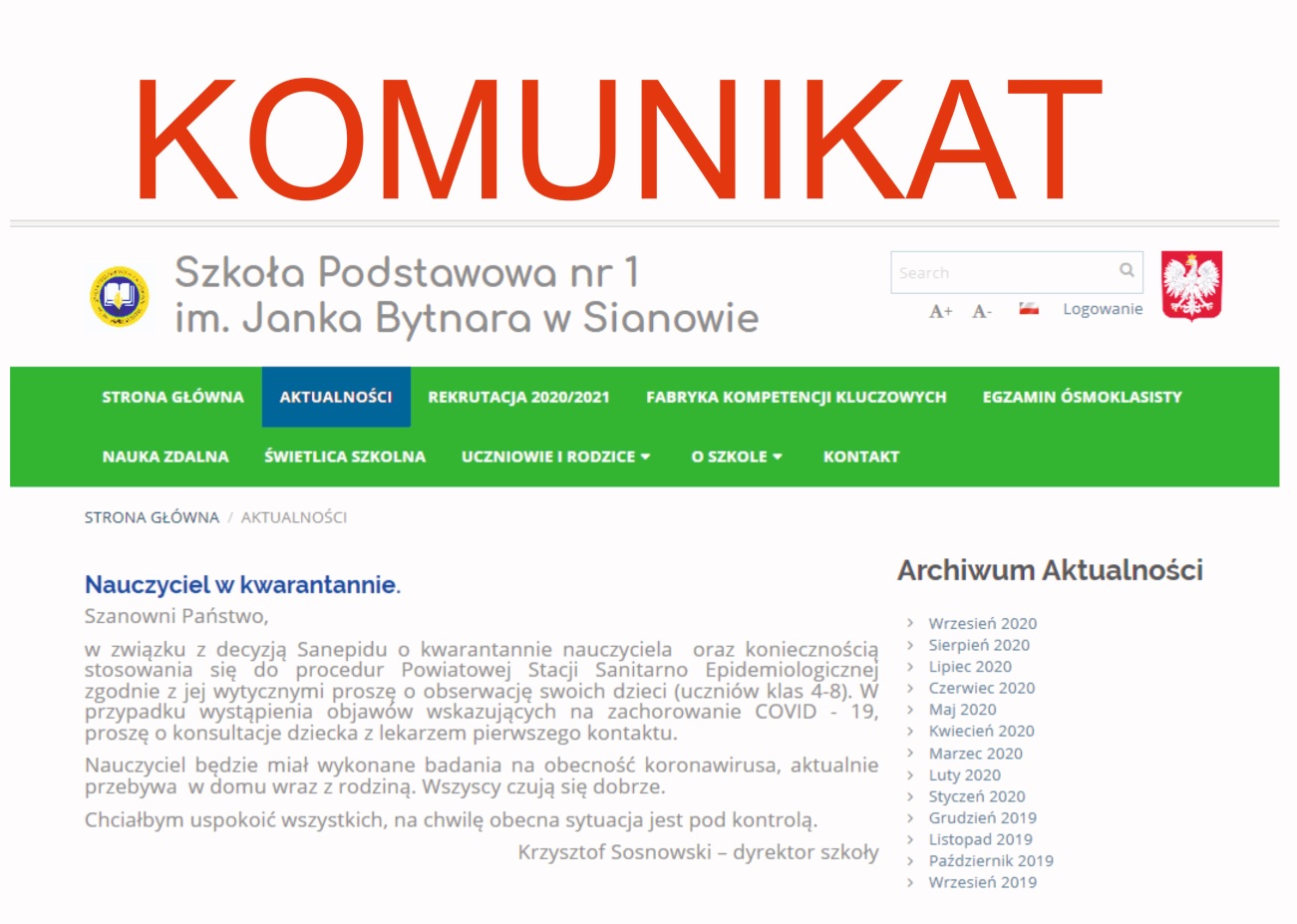w związku z decyzją Sanepidu o kwarantannie nauczyciela oraz koniecznością stosowania się do procedur Powiatowej Stacji Sanitarno Epidemiologicznej zgodnie z jej wytycznymi proszę o obserwację swoich dzieci (uczniów klas 4-8). W przypadku wystąpienia objawów wskazujących na zachorowanie COVID - 19, proszę o konsultacje dziecka z lekarzem pierwszego kontaktu.