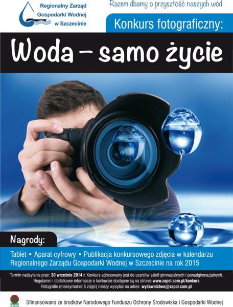 Regionalny Zarząd Gospodarki Wodnej w Szczecinie serdecznie zaprasza do wzięcia udziału w konkursie fotograficznym pn. „Woda – samo życie”, którego jest organizatorem we współpracy z firmą Zapol. Celem konkursu jest edukacja młodego pokolenia i zaszczepienie w nich szacunku do tak niezbędnego dla nas zasobu jakim jest woda. Konkurs ma zachęcić młodzież do aktywnego zaangażowania się w ochronę jednego z najważniejszych elementów środowiska, tj. zasobów wodnych. Zadaniem konkursu jest wykonanie zdjęcia/zdjęć ukazujących w ciekawy i artystyczny sposób, roli i znaczenia wody dla naszego życia.