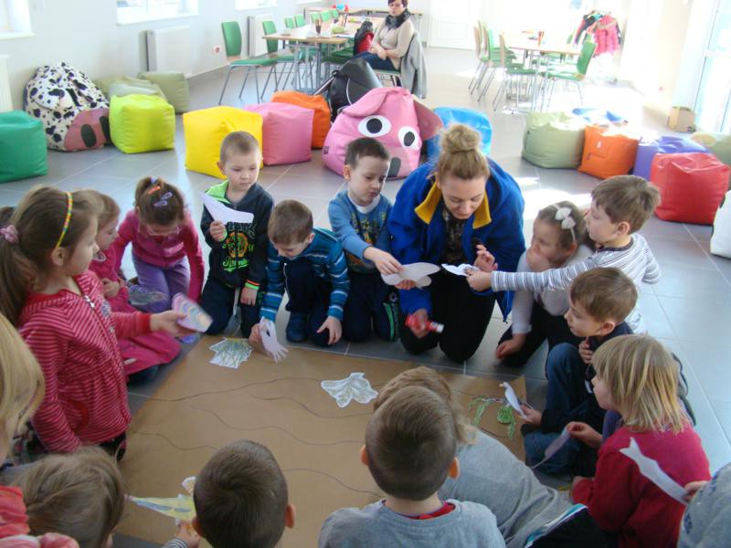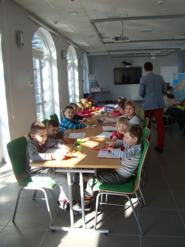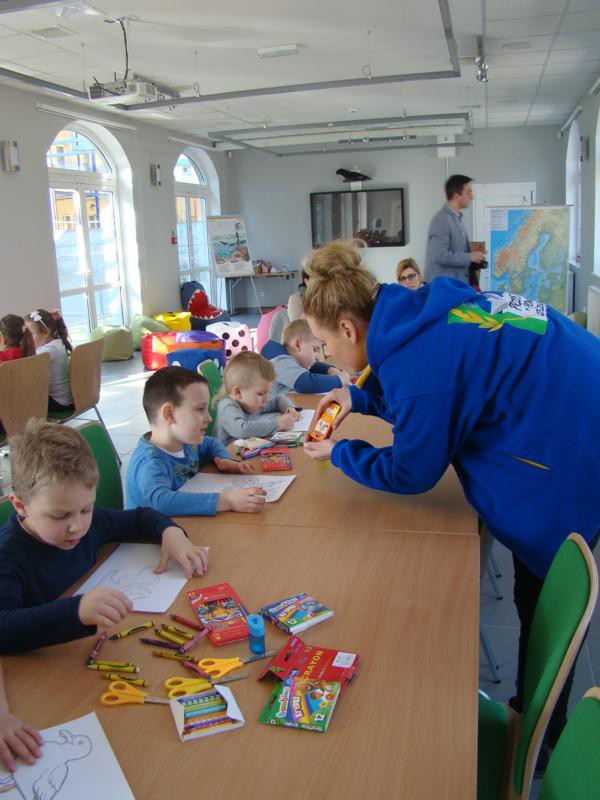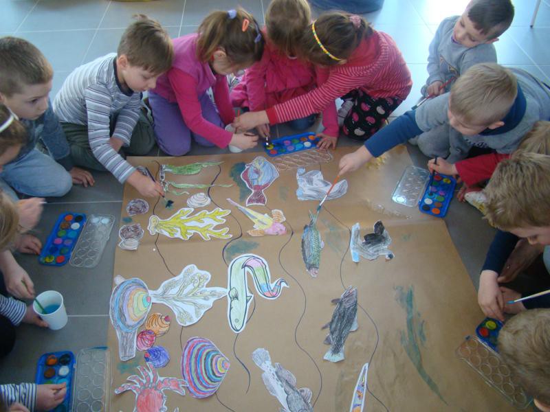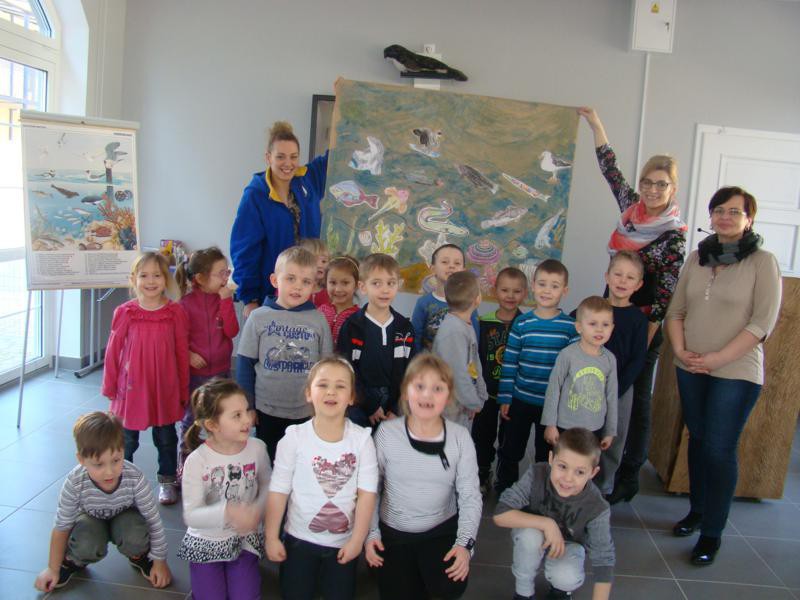 19 marca 2015 r. dzieci 5-letnie z grupy VI „KASNALE” skorzystały z zaproszenia i wybrały się na edukacyjną wycieczkę do Transgranicznego Centrum Edukacji Ekologicznej w Sarbinowie. TCEE jest usytuowane w malowniczej scenerii nadmorskiej przyrody w odległości ok. 200 m od brzegu Bałtyku. Posiada ciekawą i zabytkową architekturę wyposażoną w sale edukacyjne służące organizowaniu zajęć grupowych dla dzieci i młodzieży. Właśnie w jednej z takich sali pani Asia zorganizowała naszym małym przedszkolnym miłośnikom ekologii zajęcie edukacyjne nt. "Chronimy Morze Bałtyckie". Całe spotkanie podzielone było na dwie części: warsztaty plastyczne i wyjście w teren. Podczas zajęć warsztatowych pani Asia zapoznała przedszkolaków z geograficznym położeniem Morza Bałtyckiego na mapie oraz z mieszkańcami podwodnego świata i jego charakterystyczną roślinnością. W trakcie spotkania dzieci etapami tworzyły pracę plastyczną o naszym morzu. Najpierw kolorowały wybrane elementy wodnego świata: wodorosty, ryby, ssaki, ptaki oraz muszelki bazując na kolorowych planszach, które później samodzielnie wycinały i przyklejały je w określonych miejscach na szary arkusz papieru. Na koniec dzieci otrzymały jeszcze pędzelki i farby, którymi dopełnili swoją pracę do końca.