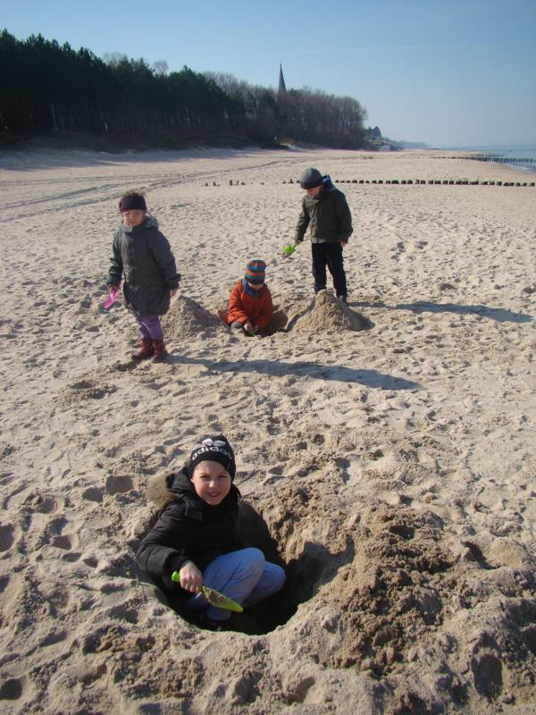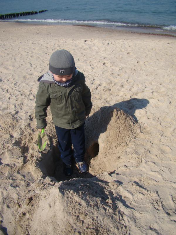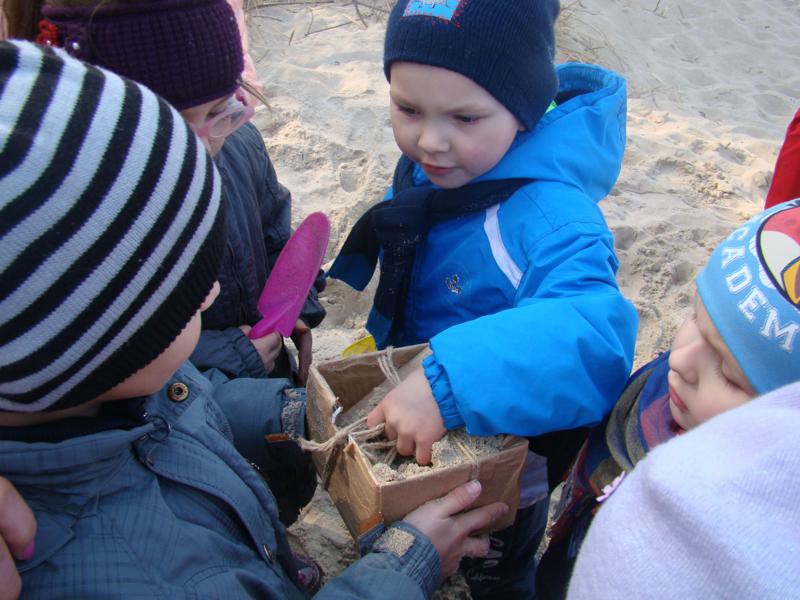 A piękna słoneczna pogoda jak nam dopisywała wprawiła dodatkowo naszych „małych poszukiwaczy” w dobry humor i zadowolenie. Czy udało się w końcu przedszkolakom dotrzeć do skarbu? Ależ owszem. Pod wskazaną tablicą wszystkie dzieci wspólnie łopatkami wykopały na plaży ukryte pudełeczko. A w nim odnaleźli morskie skarby: bursztyny, ryby i muszle. Całą przygodę dzieci zakończyły piaskowymi zamkami i otrzymanymi od organizatorów książeczkami i dyplomem. Ta edukacyjna przygoda na długo pozostanie w ich pamięci. Pragniemy jeszcze raz bardzo serdecznie podziękować kierownictwu TCEE w Sarbinowie i pani Asi za ciekawą i pouczającą lekcję z ekologii.