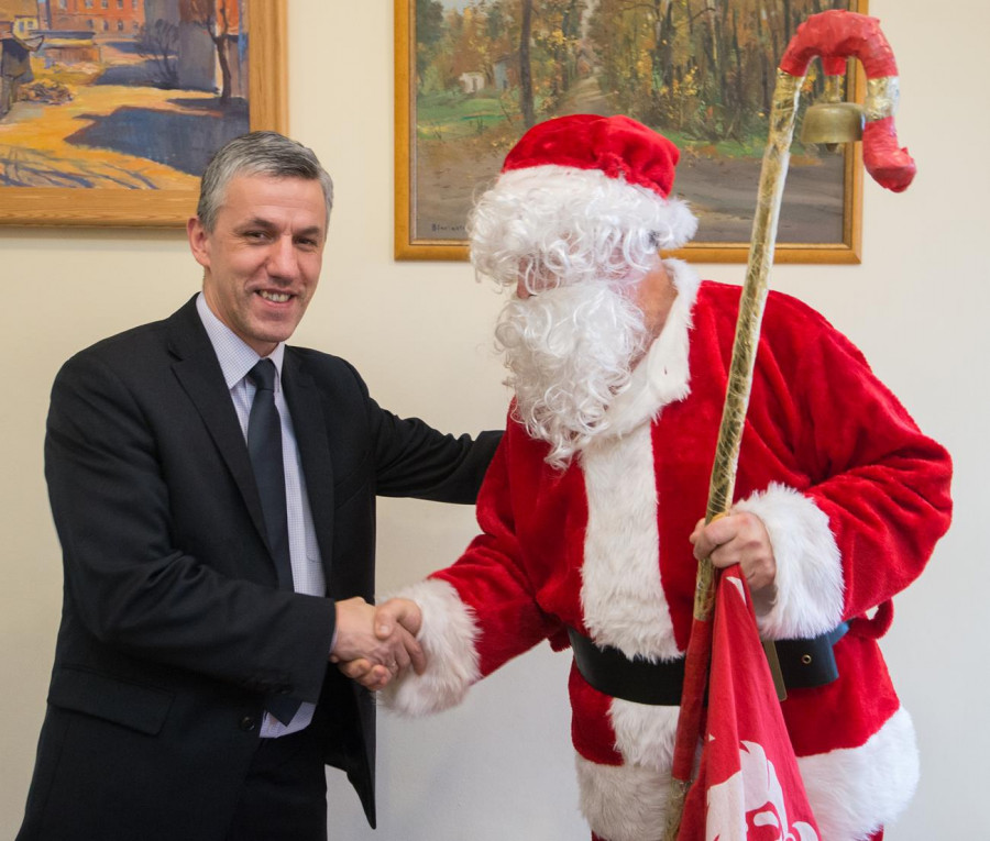Sianów jest miejscem chętnie odwiedzanym przez różnych ciekawych gości. Tym razem z okazji zbliżających się Mikołajek nasze miasto odwiedził sam Święty Mikołaj. Serdeczny gość wraz ze swoimi pomocnikami: Marcinem Posmykiem, Zastępcą Burmistrza Gminy i Miasta Sianów oraz Tomaszem Przygudzkim, Radnym Rady Miejskiej w Sianowie, odwiedził uczniów klas 1-3 sianowskich szkół podstawowych w trakcie Sprawnościowych Zawodów Mikołajkowych zorganizowanych w hali sportowej przy Szkole Podstawowej nr 2 w Sianowie. Obecność Mikołaja uświetniła wspaniałą sportową zabawę, a każde z dzieci otrzymało słodki upominek. Mikołaj odwiedził także pracowników Urzędu Gminy i Miasta i nie zapomniał o uściśnięciu dłoni Burmistrzowi Maciejowi Berlickiemu.