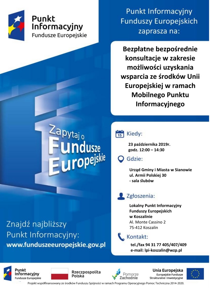 Lokalny Punkt Informacyjny Funduszy Europejskich w Koszalinie wraz z Urzędem Gminy i Miasta w Sianowie, serdecznie zapraszają na indywidualne spotkanie – rozmowę ze specjalistą ds. funduszy europejskich w ramach Mobilnego Punktu Informacyjnego, podczas którego będzie można otrzymać informację m.in. o: