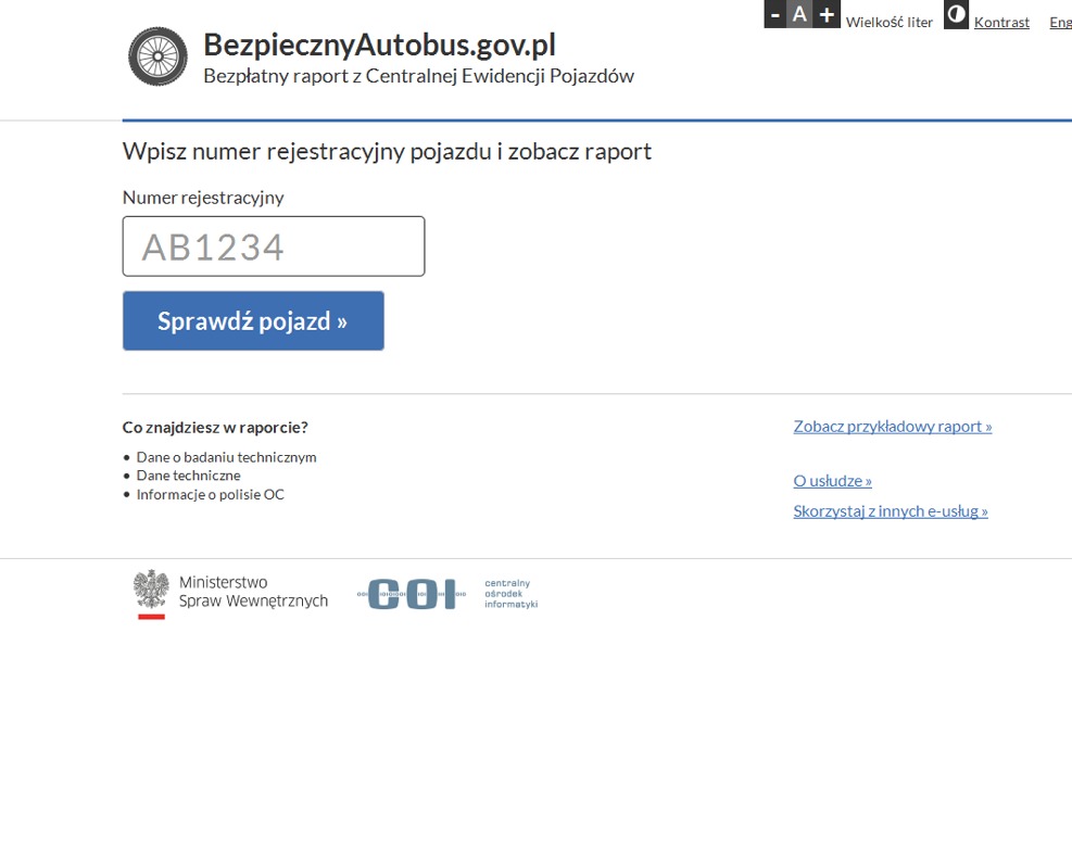 Kolejna usługa to Bezpieczny autobus. W tej usłudze, po podaniu tylko numeru rejestracyjnego autobusu, można sprawdzić podstawowe dane na jego temat. Dzięki temu przed wyjazdem na wycieczkę można się upewnić m.in. czy autobus, którym my lub nasi bliscy będą jechać, ma ważne badanie techniczne, aktualne OC oraz czy nie jest oznaczony jako wycofany z ruchu.