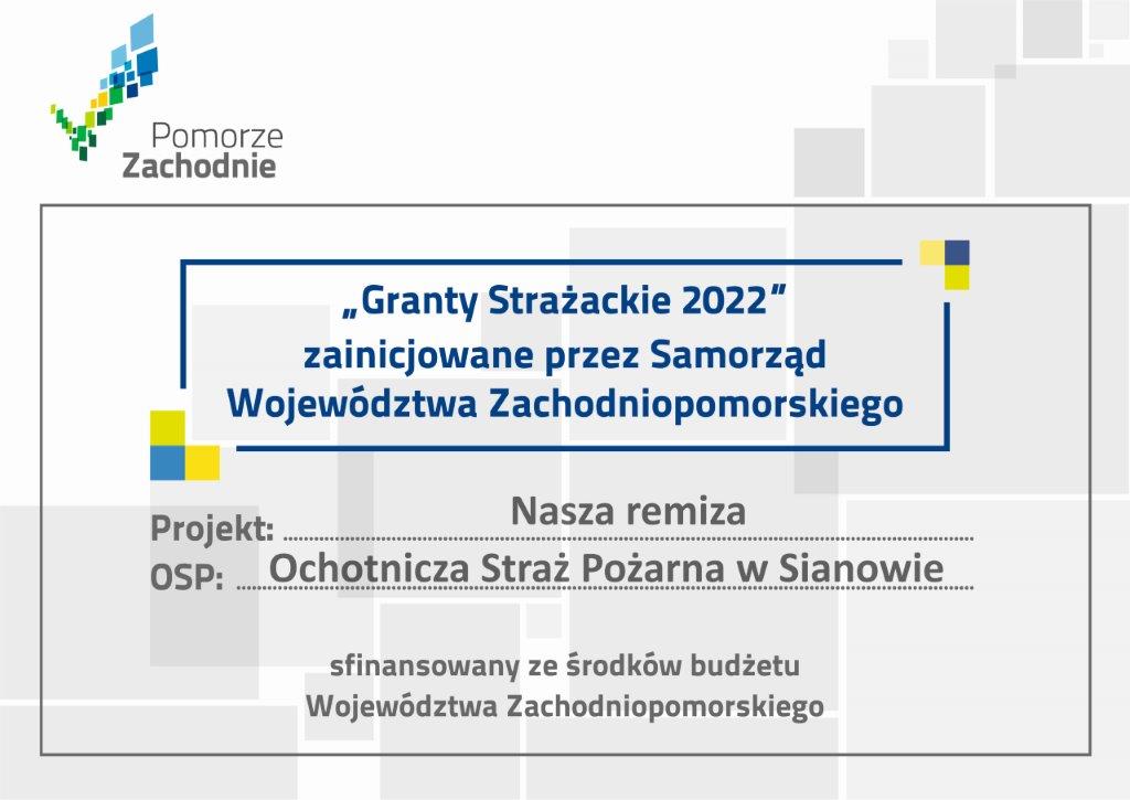 W październiku 2022 roku ruszyła realizacja projektu Nasza remiza w ramach zadania:  Wykonanie prac remontowych, modernizacyjnych i konserwatorskich w budynkach OSP (Ochotniczych Straży Pożarnych) oraz ich otoczenia. Kwota dofinansowania udzielona na prace remontowe remizy strażackiej w Sianowie wyniosła 19 505 zł.