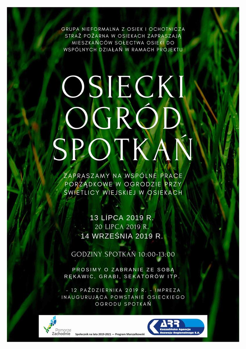 Celem głównym projektu jest wzrost aktywności społecznej mieszkańców sołectwa Osieki poprzez zaangażowanie w inicjatywę lokalną polegającą na utworzeniu dobra wspólnego: Osieckiego ogrodu spotkań. Dostosowanie przestrzeni publicznej do potrzeb mieszkańców i rozwój infrastruktury rekreacyjnej służącej zaspokajaniu ich potrzeb, nastąpi w wyniku organizacji cyklu spotkań wolontariackich.