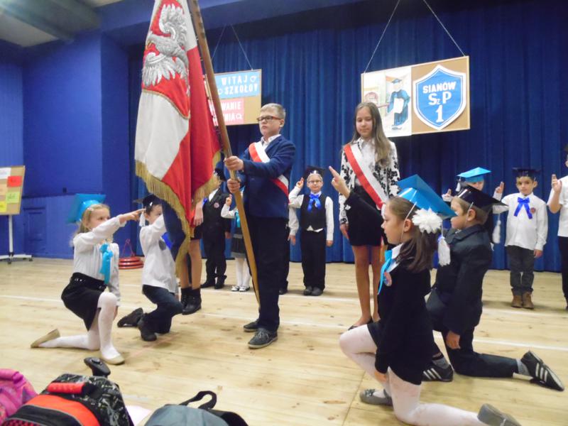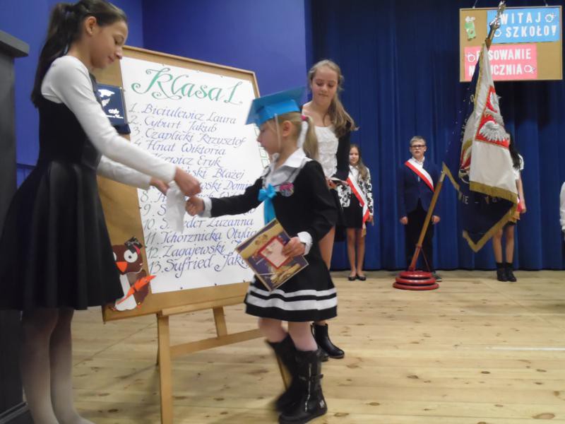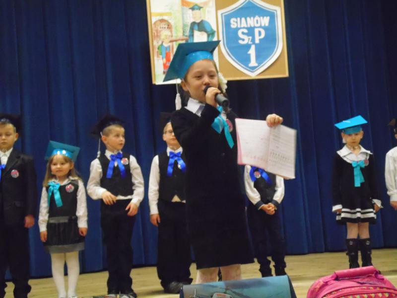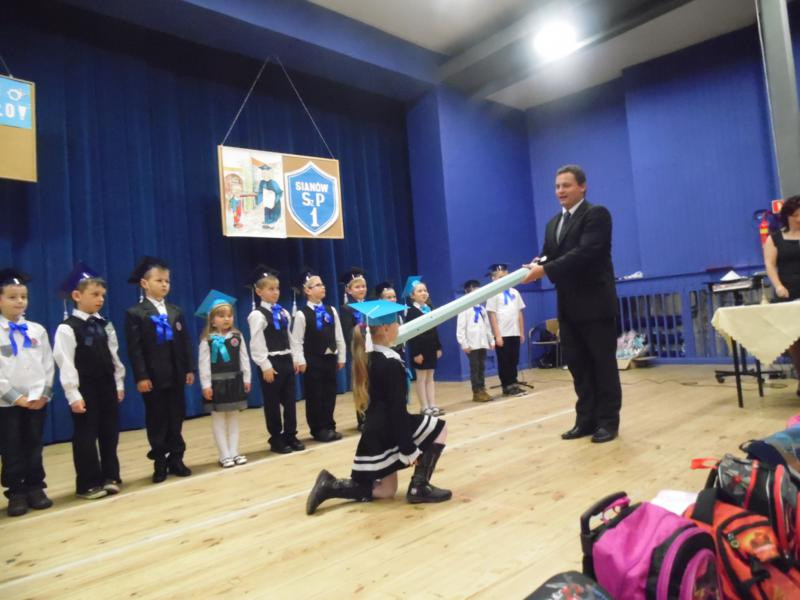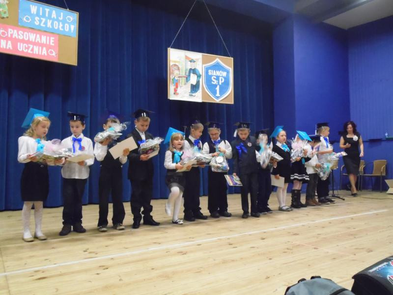 Przez cały miesiąc pierwszaki przygotowywały się do uroczystości, ucząc się wierszyków i piosenek. W końcu nadszedł dzień pasowania. Tego dnia cała klasa odświętnie ubrana, w czapkach żakowskich, cała klasa stawiła się na pasowanie. Przewodnicząca samorządu szkolnego, Katarzyna Gomułka rozpoczęła uroczystość. Po powitaniu gości Dyrektor szkoły Sebastian Bober poprosił księdza proboszcza, Zbigniewa Waszkiewicza o poświecenie tornistrów. Następnie każdy pierwszak złożył uroczyste ślubowanie. Dyrektor szkoły, kładąc wielki ołówek na ramieniu każdego z 13. Pierwszoklasistów, pasował go na ucznia. Wychowawczyni klasy, Iwona Łyskawka, wręczyła uczniom pamiątkowe dyplomy oraz legitymacje szkolne. Na akcie ślubowania dzieci złożyły podpisy przyrzekając, że będą dobrymi uczniami, szlachetnymi Polakami i postarają się godnie reprezentować imię Szkoły Podstawowej nr 1 w Sianowie. Na koniec uroczystości uczniowie odśpiewali piosenkę pierwszoklasisty pt.„ Ślubowanie”.