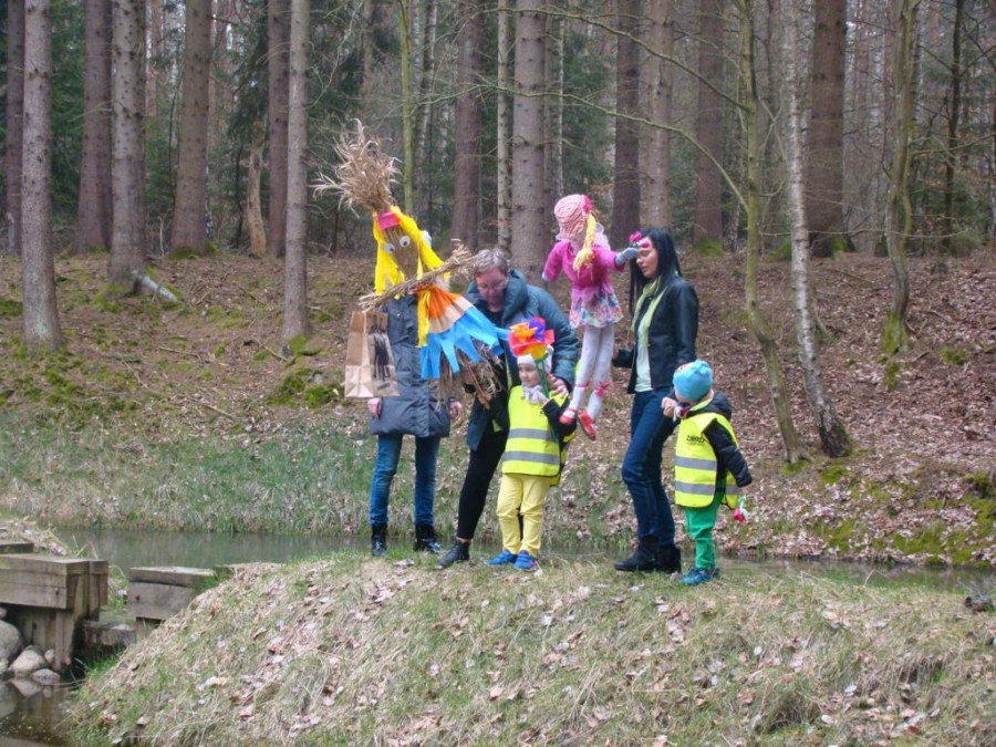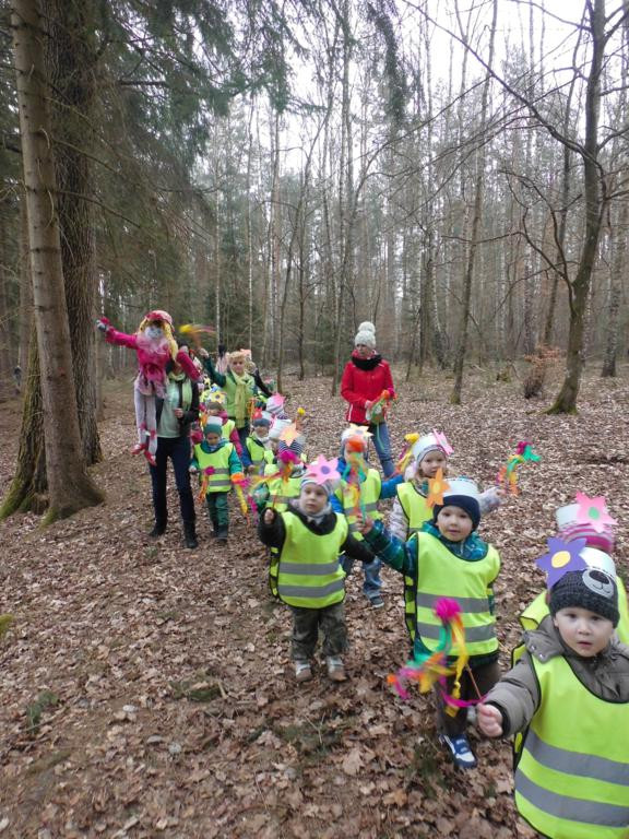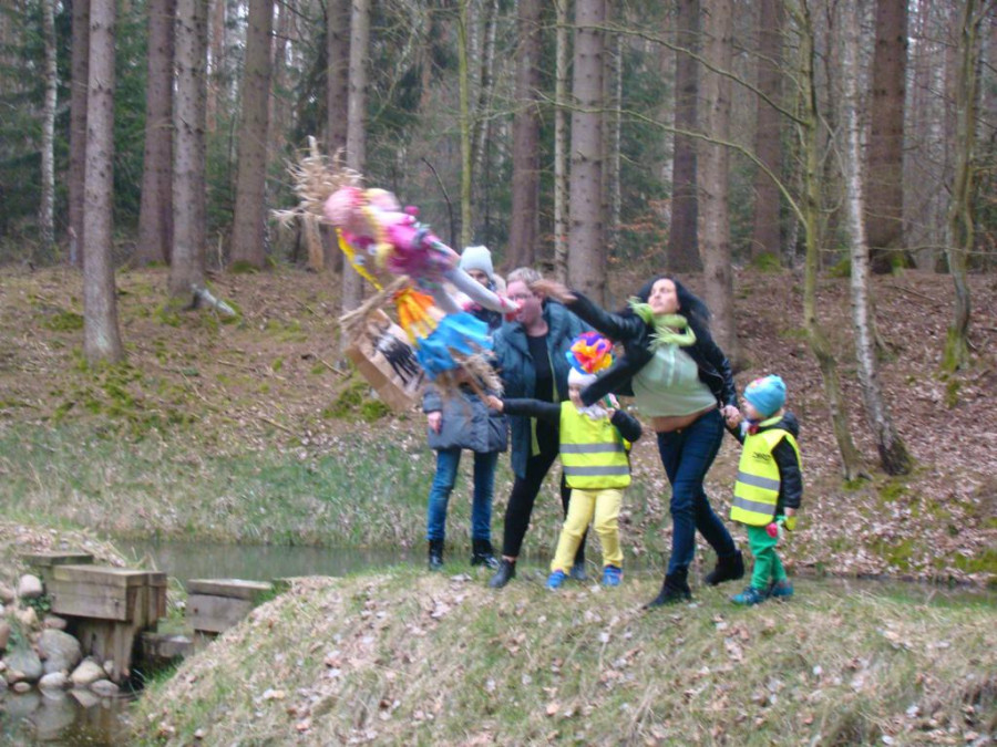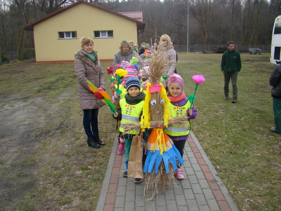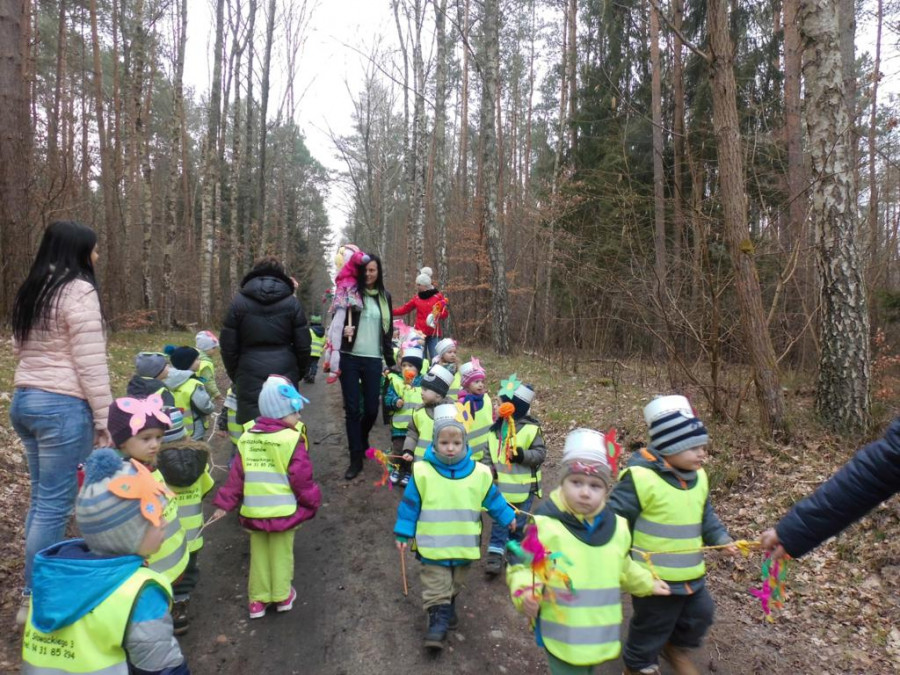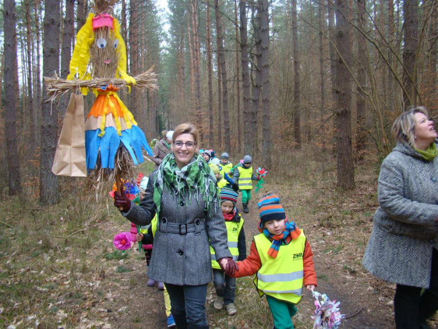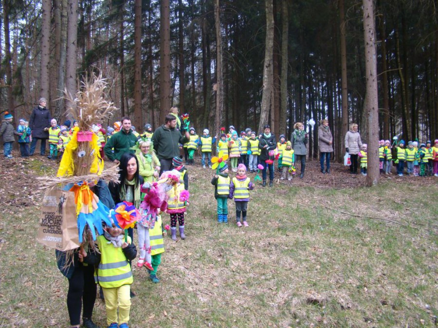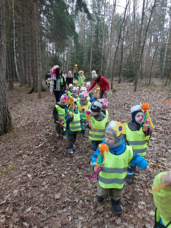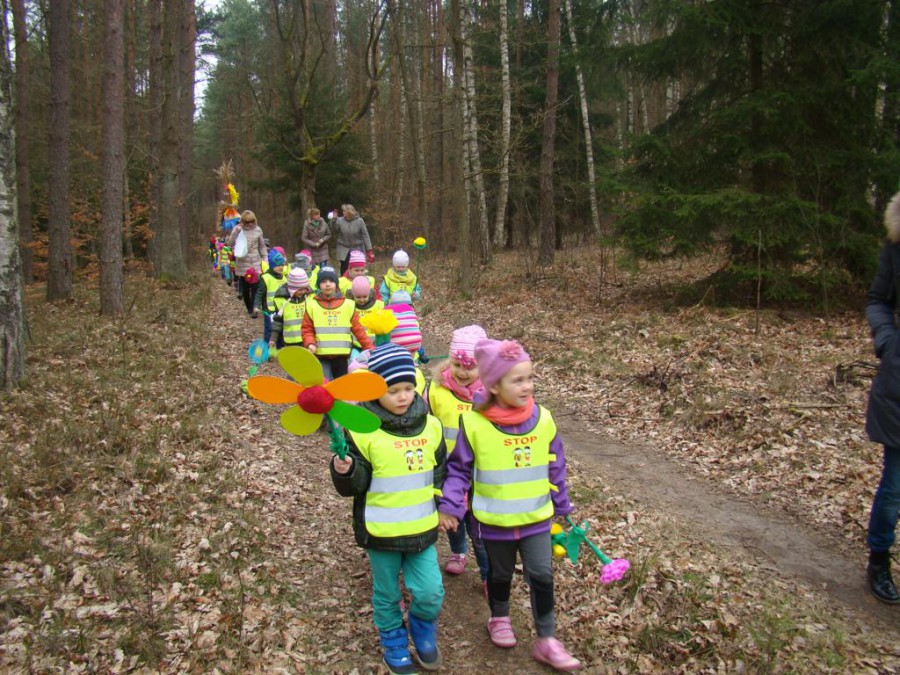 W barwnym korowodzie wspólnie z panią Dagny Staszewską oraz leśnikami przemaszerowaliśmy leśnymi drogami do zbiornika wodnego, gdzie przy głośnych okrzykach: ZIMO ZNIKAJ- WIOSNO WITAJ dokonaliśmy uroczystego pożegnania zimy i wrzuciliśmy słomiane kukły do wody. Każda grupa zaprezentowała również wiosenną piosenkę, aby wiosna na dobre zagościła w przyrodzie.