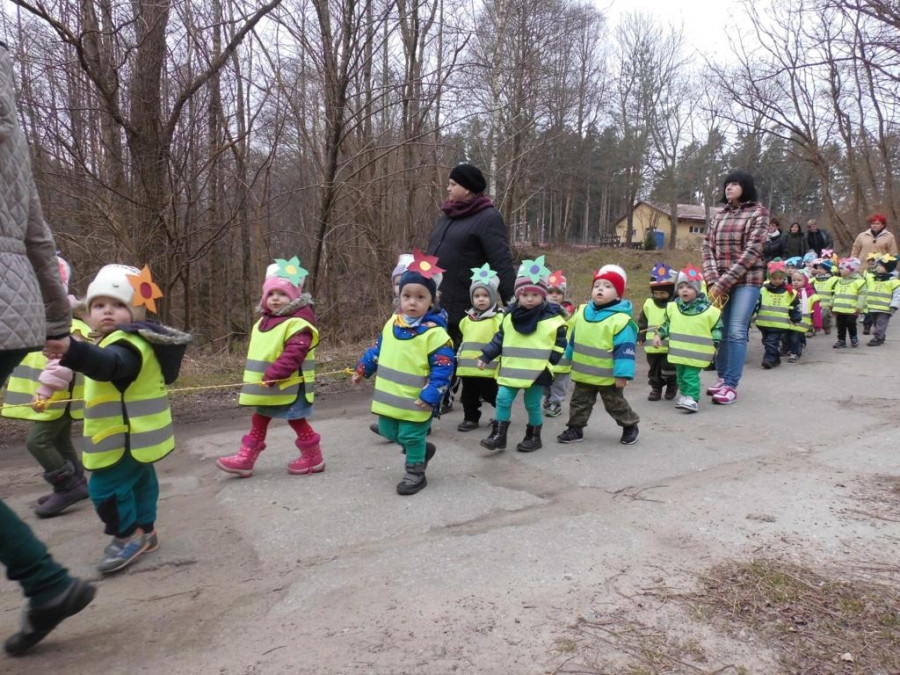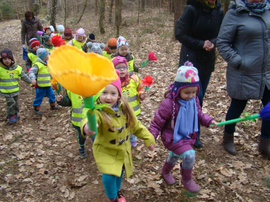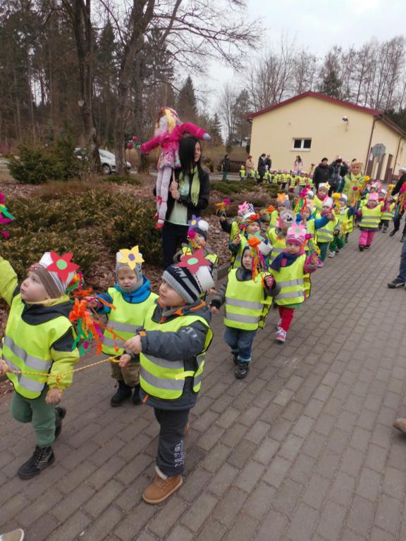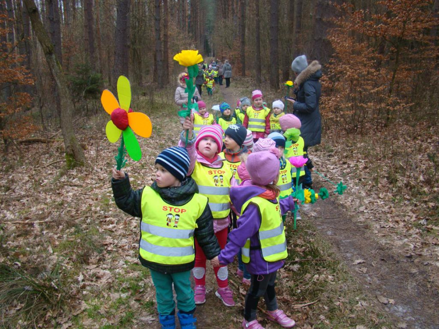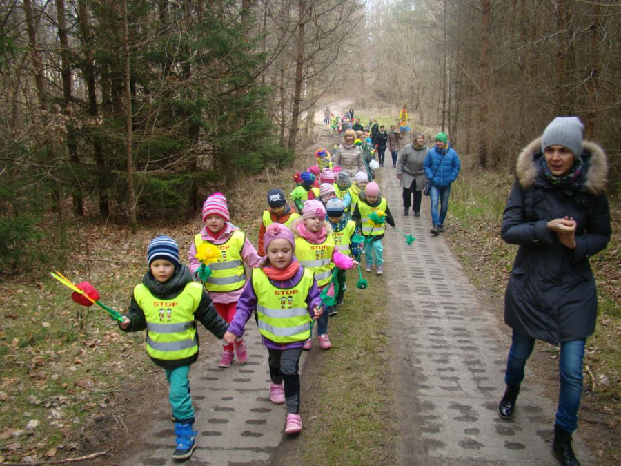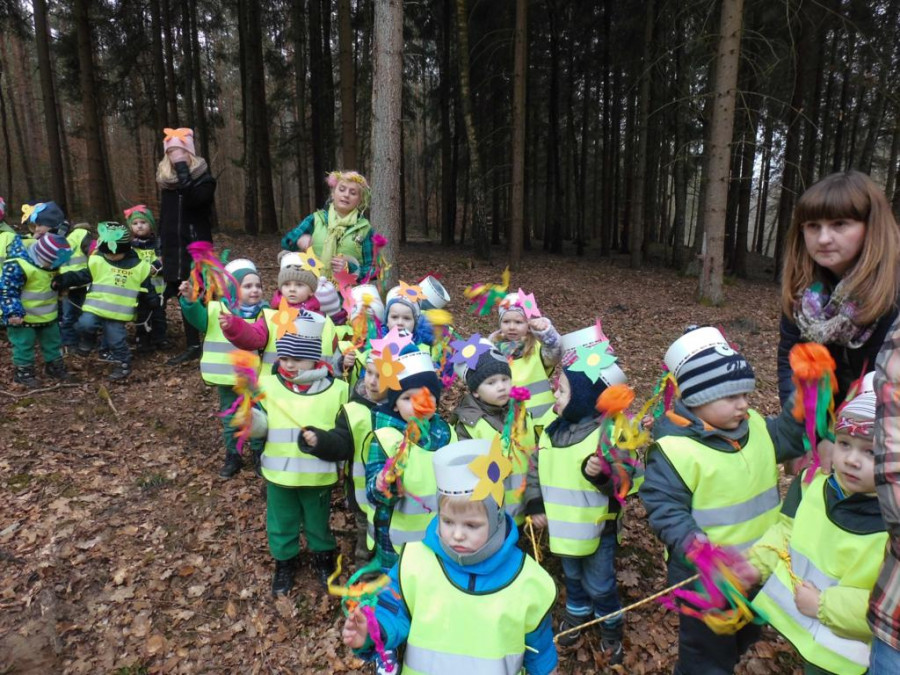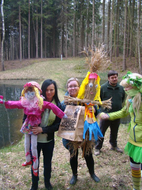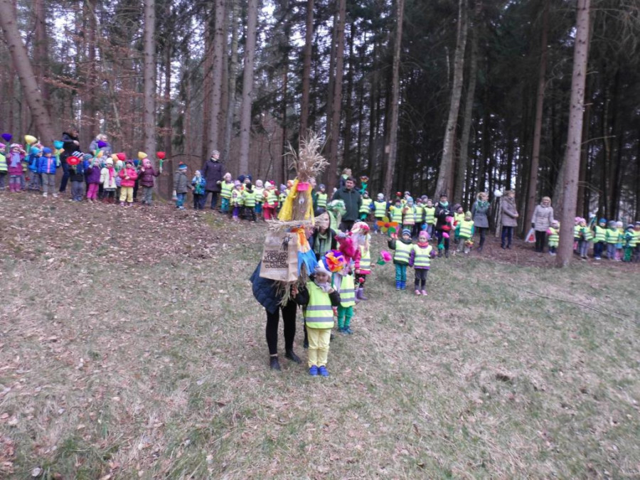 W barwnym korowodzie wspólnie z panią Dagny Staszewską oraz leśnikami przemaszerowaliśmy leśnymi drogami do zbiornika wodnego, gdzie przy głośnych okrzykach: ZIMO ZNIKAJ- WIOSNO WITAJ dokonaliśmy uroczystego pożegnania zimy i wrzuciliśmy słomiane kukły do wody. Każda grupa zaprezentowała również wiosenną piosenkę, aby wiosna na dobre zagościła w przyrodzie.