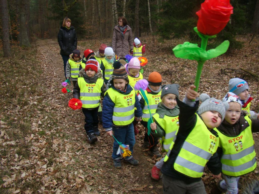 Żegnając się z pracownikami Nadleśnictwa podziękowaliśmy za miłe spotkanie i podarowaliśmy gospodarzom kolorowe papierowe kwiaty przygotowane przez dzieci i ich rodziców.