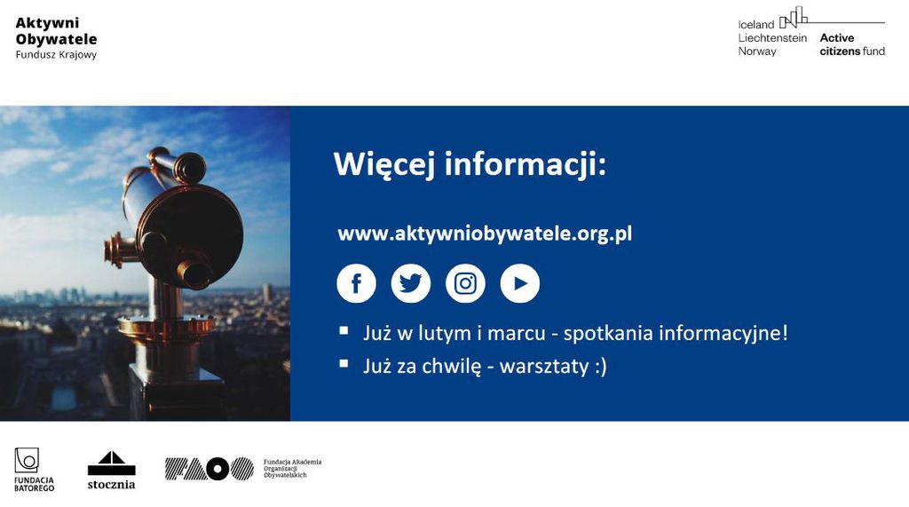 Więcej informacji o programie Aktywni Obywatele – Fundusz Krajowy: www.aktywniobywatele.org.pl