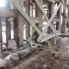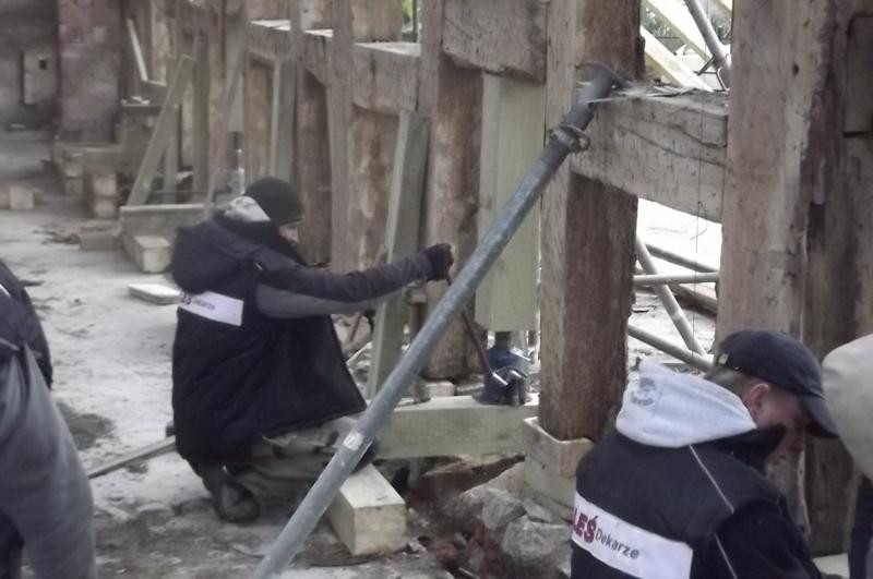 W dalszej kolejności będą mogły być posadowione belki podwalinowe, które stanowią oparcie dla konstrukcji kościoła. Brygada dekarzy PUB 'Leś' to młodzi ludzie, ale z konsekwencją i precyzją realizują to zadanie. Podnoszenie lewarkami o udźwigu ok.10 ton przebiega bez zakłóceń. Lewa strona kościoła od ul.Kościelnej spoczywa na 4 słupach wcześniej ustabilizowanych i zabezpieczonych, by uniknąć ewentualnego przemieszczenia.