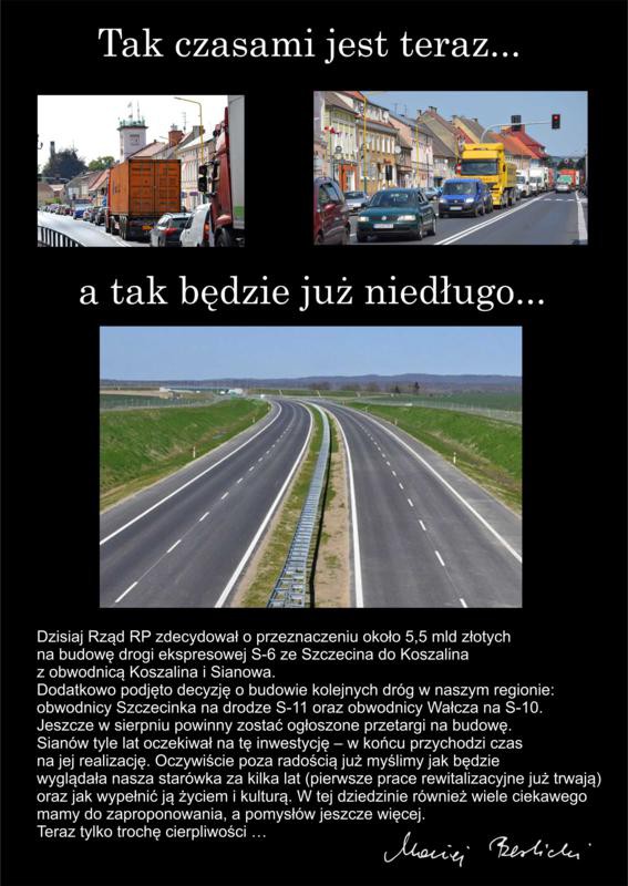 Dzisiaj Rząd RP zdecydował o przeznaczeniu około 5,5 mld złotych na budowę drogi ekspresowej S-6 ze Szczecina do Koszalina z obwodnicą Koszalina i Sianowa. Dodatkowo podjęto decyzję o budowie kolejnych dróg w naszym regionie: obwodnicy Szczecinka na drodze S-11 oraz obwodnicy Wałcza na S-10. Jeszcze w sierpniu powinny zostać ogłoszone przetargi na budowę.