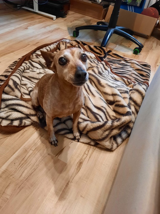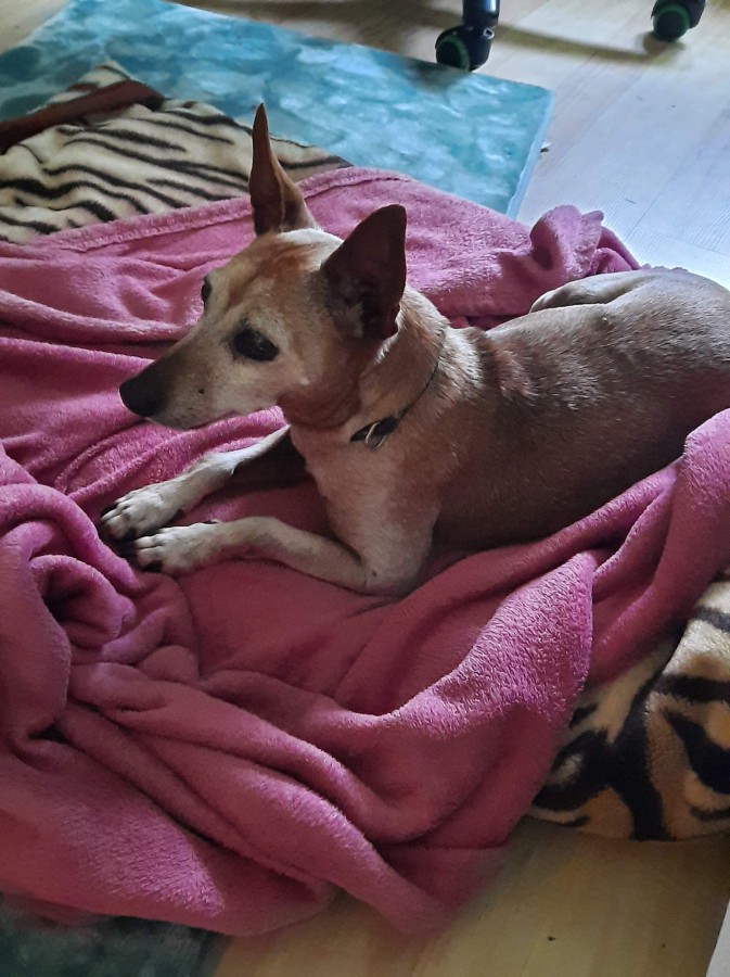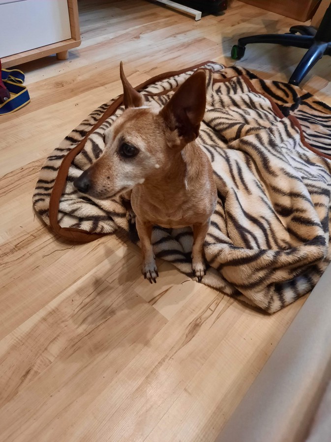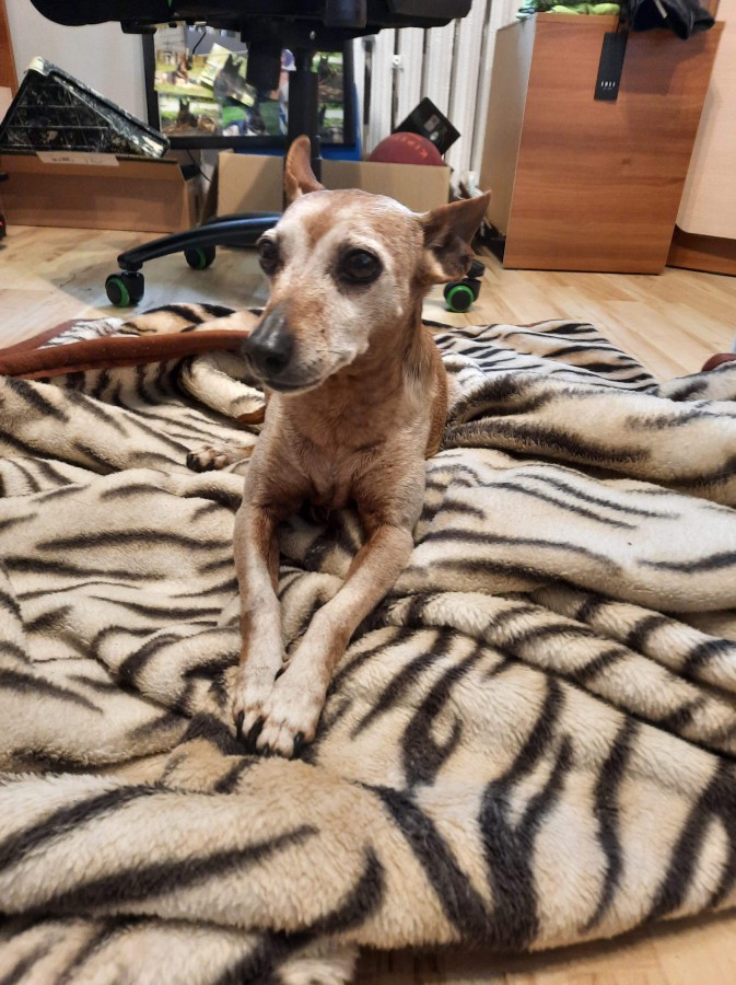 Drobna suczka, niewielkiego wzrostu z rasy Pinczer Miniaturowy o maści waniliowej, wysterylizowana, czysta, zadbana, bardzo przyjazna choć wystraszona, czeka na nowego właściciela.