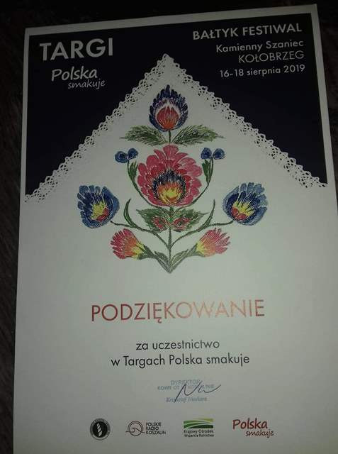 Koło Gospodyń Wiejskich w Wierciszewie Kreatywnych Mieszkańców oraz zespół Kwiat Paproci na Targach Polska Smakuje, które odbyły się w dniach 16-18 sierpnia 2019r. w Kołobrzegu na Kamiennym Szańcu. To duża impreza mająca na celu promocję polskiej kuchni, polskich wyrobów, kultury i tradycji ludowej oraz obszarów wiejskich. W wydarzeniu udział wzięli producenci regionalnej, ekologicznej i certyfikowanej żywności z województw zachodniopomorskiego i lubuskiego. Uczestniczyły też Koła Gospodyń Wiejskich, które zaprezentowały swoje tradycyjne potrawy i pokazy rękodzielnictwa. Koło Gospodyń Wiejskich z Wierciszewa na Targach Polska Smakuje oferowało sprzedaż własnych produktów. Były to ciasta buraczkowe z czekoladą, marchewkowe z orzechami, cukiniowe z nutą cytryny, szarlotka, sernik, malinowe na kruchym cieście, smalec z cebulką i jabłkiem, ogórki małosolne, ogórki kiszone z buraczkami, paprykę kiszoną. Na stoisku na bieżąco były smażone racuchy drożdżowe oraz naleśniki, które przypominały smak z dzieciństwa. Podawane były z konfiturą aroniowo-jabłkową i z musem jabłkowym posypane cukrem pudrem. Do degustacji był dżem turkusowy z ogórków i ketchup z cukinii. Wszystko co było oferowane przez KGW cieszyło się dużym zainteresowaniem wśród kupujących - przetwory pochodziły z naszych ogrodów. Kołobrzeg to świetne miejsce do promowania żywności – przyjeżdża tu bardzo dużo turystów także z zagranicy. Super impreza, miła atmosfera . Dziękujemy organizatorom.