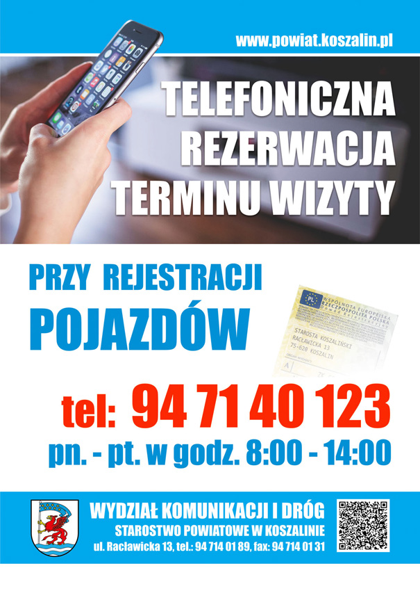 Wydział Komunikacji i Dróg Starostwa Powiatowego w Koszalinie informuje, że od dnia 09.01.2015 r. można dokonać rezerwacji terminu wizyty w sprawie rejestracji, przerejestrowania pojazdu i innych spraw dotyczących pojazdów pod nr tel. (94) 71 40 123 w godzinach od 8:00 do 14:00. Rezerwacji można dokonać maksymalnie do 2 tygodni przed planowaną wizytą.