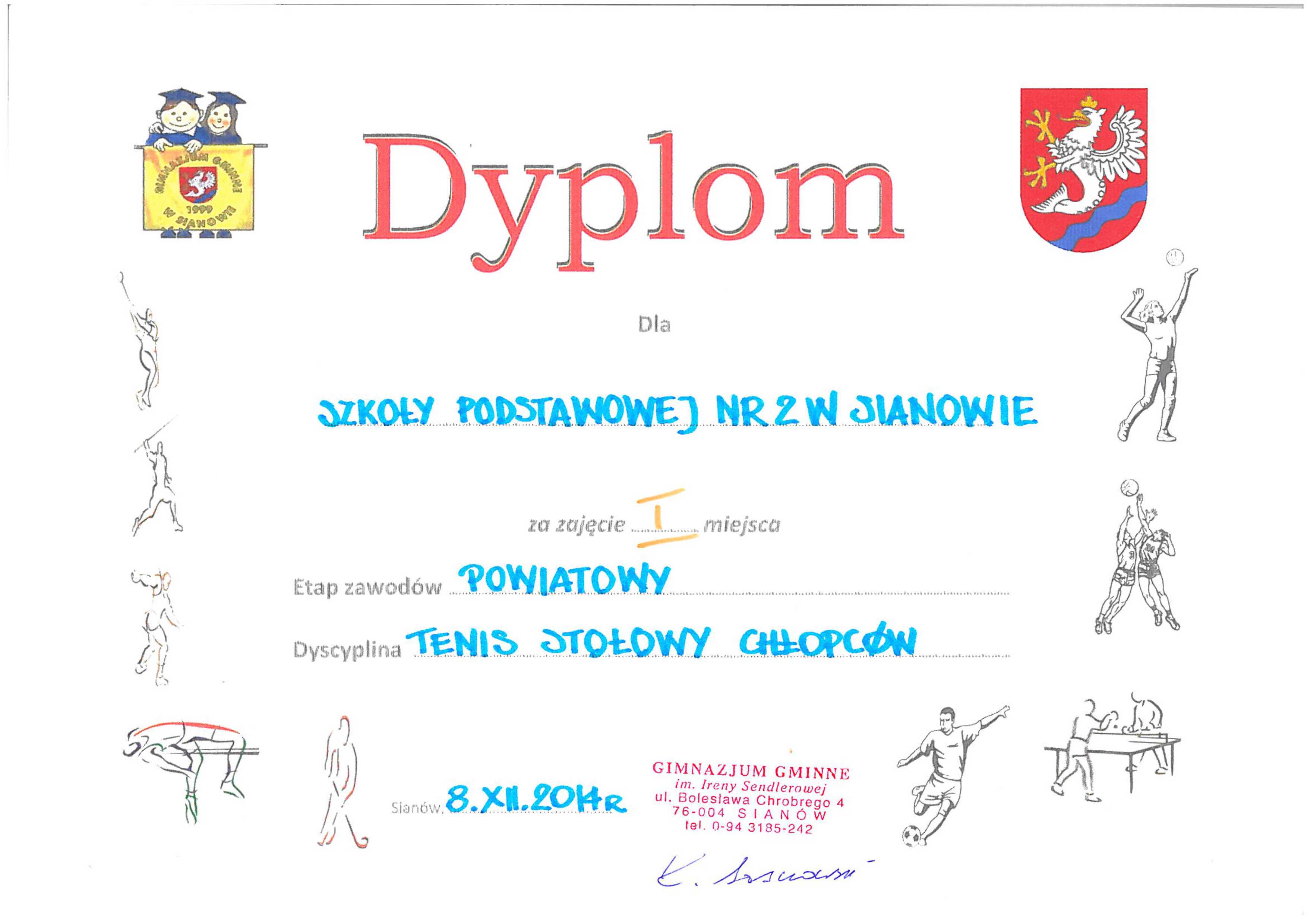 Bardzo miłą niespodziankę sprawili swojemu opiekunowi Jędrzejowi Bieleckiemu i Szkole Podstawowej nr 2 w Sianowie tenisiści stołowi zarazem uczniowie SP 2 Mateusz Wróblewski i Marcin Grenda wygrywając w Mistrzostwach Powiatu Ziemskiego Koszalin w ramach Igrzysk Młodzieży Szkolnej Szkolnego Związku Sportowego. Młodzi tenisiści wygrali 3:1 z  SP Mścice i 3:0 z SP Rosnowo i tym samym zostali mistrzami powiatu i po raz pierwszy od wielu lat awansowali do zawodów regionalnych.