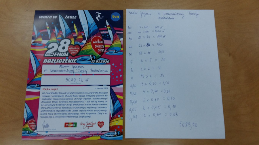 VII Wielkoorkiestrowy Turniej Badmintona w Sianowie za nami. Jak zawsze szybko minęło. Kilkanaście dni przygotowań, setki telefonów, kilkanaście kilometrów w nogach, ale warto było. Fantastyczna atmosfera, ponad 40 zawodników, 5 kategorii, ponad 75 rozegranych meczy, 9 godzin zmagań na kortach, większość rzeczy wylicytowana, wielkie serca zawodników i kibiców. Wreszcie pełna puszka i prawie żadnych monet (zebrana kwota to 5.089,72 zł). To wszystko dzięki Wam, moi drodzy pasjonaci lotki. Wszystkim serdecznie dziękuję za udział i niezapomniane emocje. Gra na najwyższym poziomie, prawdziwa walka nie tylko na korcie, ale również podczas licytacji powoduje, że warto to kontynuować. W sobotę wszyscy byli zwycięzcami i zasłużyli na złoto. Brawo WY.