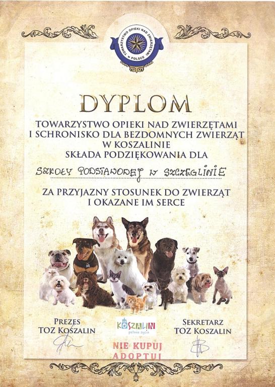 Uczniowie z koła przyrodniczego prowadzonego w Szkole Podstawowej w Szczeglinie przez panią Annę Grębską pojechali do Schroniska dla Bezdomnych Zwierząt "Leśny Zakątek" w Koszalinie. Powodem wizyty było zakończenie akcji pod hasłem "Pełna miska dla zwierzaka ze schroniska". Uczniowie przekazali wszystkie zebrane dary, które przez miesiąc systematycznie były gromadzone w szkole. Udało się zebrać wiele kilogramów karmy, koce i ręczniki. Pracownik schroniska opowiedział o zasadach funkcjonowania "Leśnego Zakątka". Uczniowie, spacerując po terenie, zobaczyli w jakich warunkach żyją zwierzęta. Obecnie przebywa tutaj 240 psów i 40 kotów, z których każdy ma swoją, najczęściej smutną, historię.