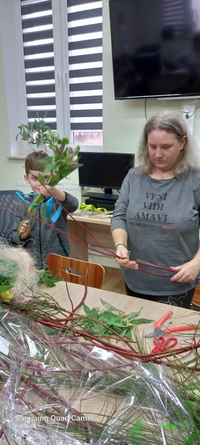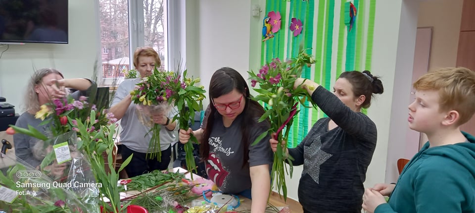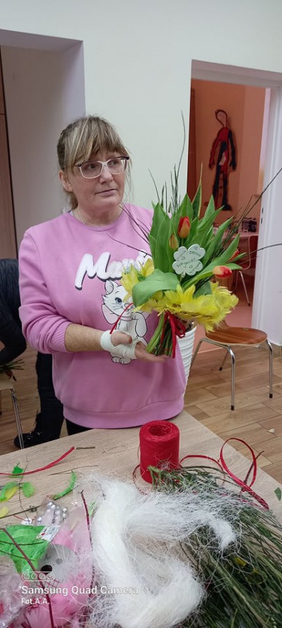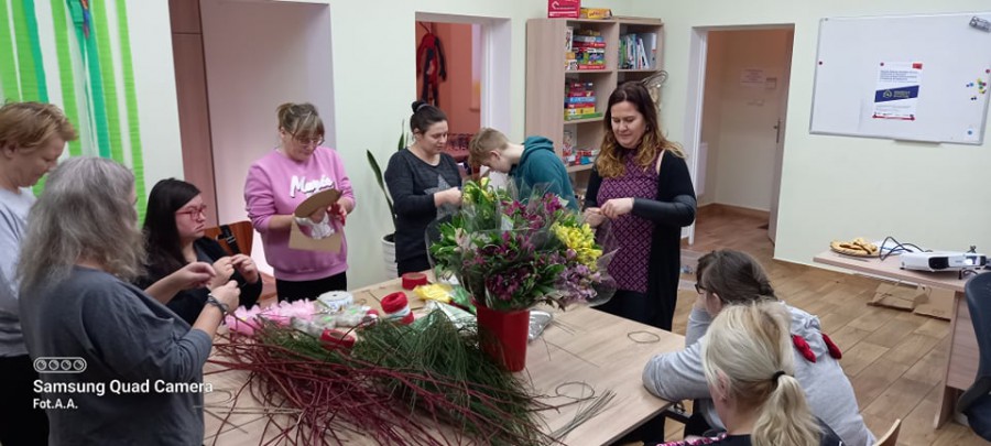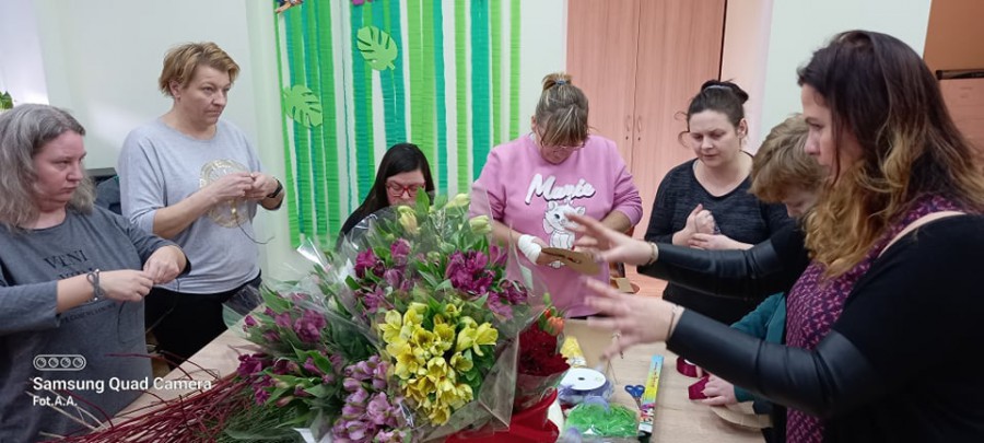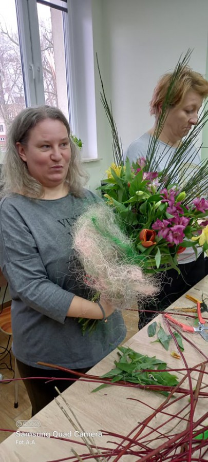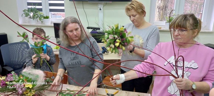 Na ostatnich zajęciach florystyczno-bukieciarskich uczestniczki Sianowskiego Klubu Integracji Społecznej nauczyły się jak wykonać kryzę - dekoracyjną cześć bukietu. Można ją wypleść ze sznurka, z cienkiego ozdobnego drutu, patyków, kory, drutu aluminiowego, siatki miedzianej, kartonu omotanego wstążką i z tysiąca innych oczywistych i zupełnie nieoczywistych materiałów. Uczestniczki zajęć zapoznały się ze sposobem wykonania kryzy po czym przystąpiły do jej wykonania. Zadanie nie było łatwe i wymagało koncentracji oraz cierpliwości. Później była znacznie przyjemniejsza część zajęć… a mianowicie układanie bukietów kwiatowych.