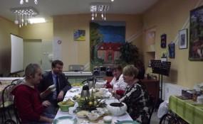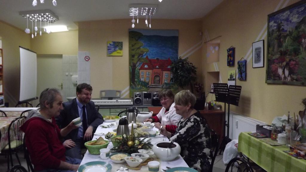 Zorganizowanie wigilijnego stołu dla bezdomnych, samotnych stało się już tradycją. Specjalnymi gośćmi dzisiejszej wigilii byłi: Marcin Posmyk - zastępca burmistrza który wraz z gospodarzem Haliną Iwanisik – Kierownikiem Miejsko-Gminnego Ośrodka Pomocy Społecznej w Sianowie złożyli bożonarodzeniowe życzenia- aby na czas Bożego Narodzenia zapomnieli o nieporozumieniach, bólach i żyli nadzieją, która płynie z Betlejem, miasta chleba, światła i dobrej nowiny” by te święta były dla wszystkich dniem pokoju i radości. Otrzymali również paczkę z  typowo świątecznymi potrawami.