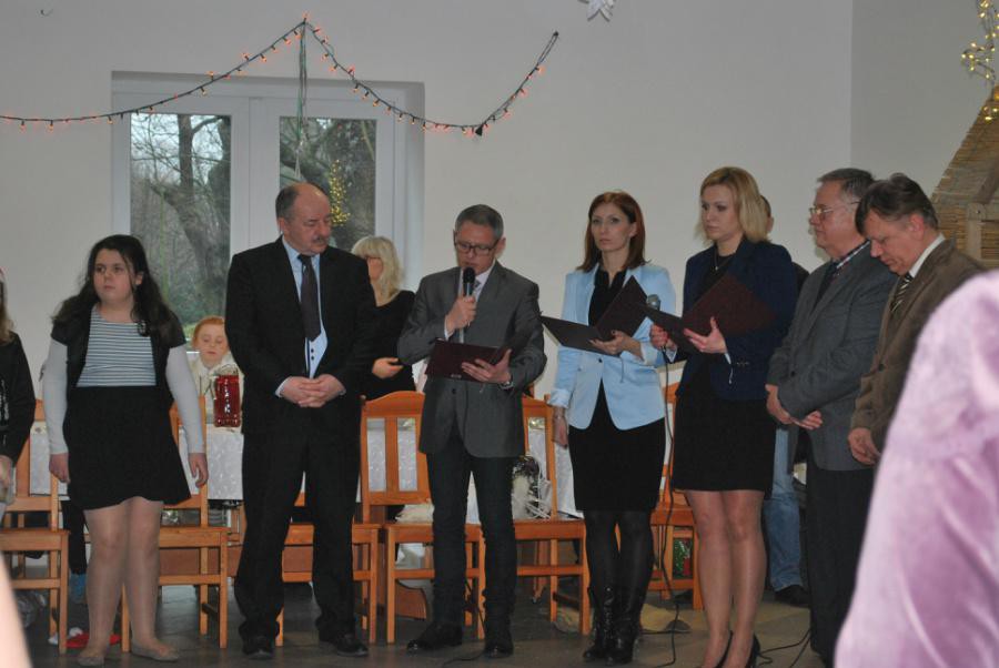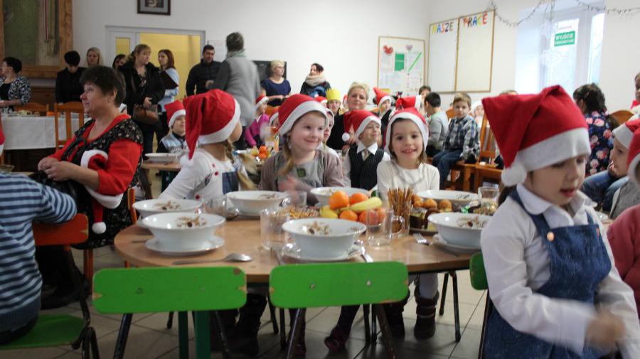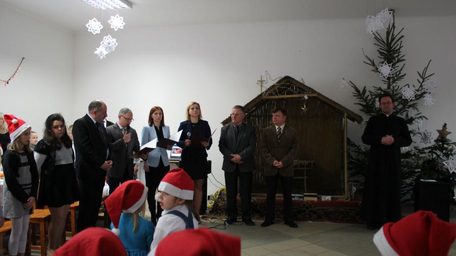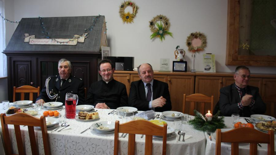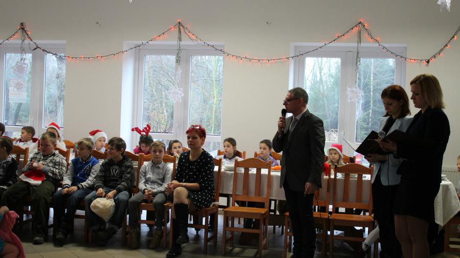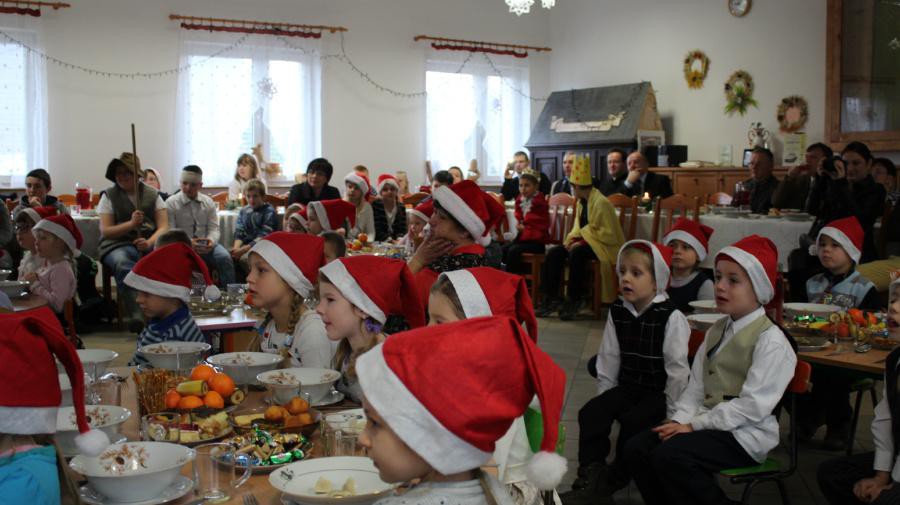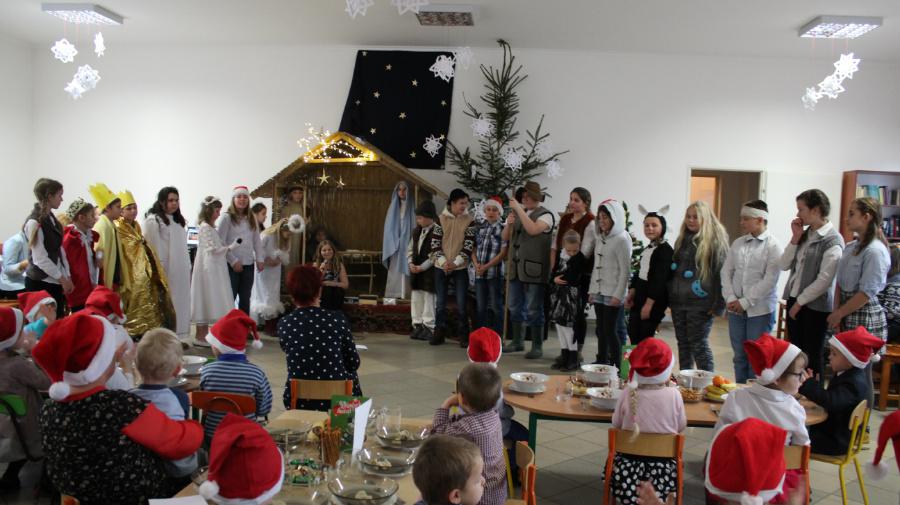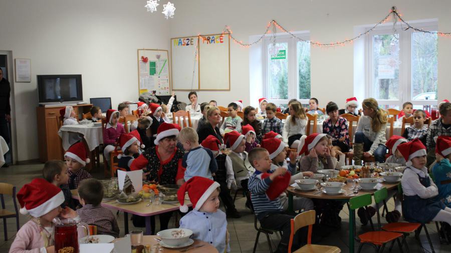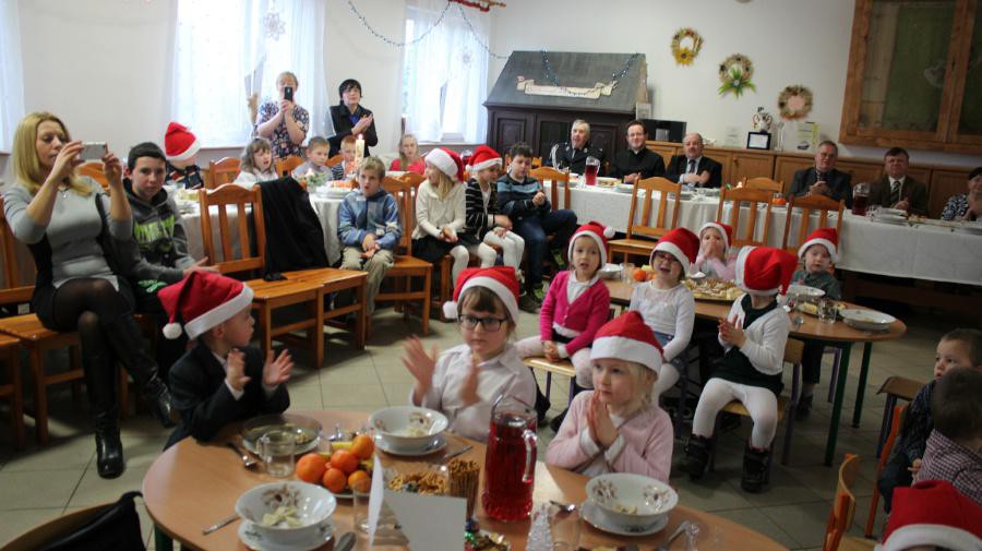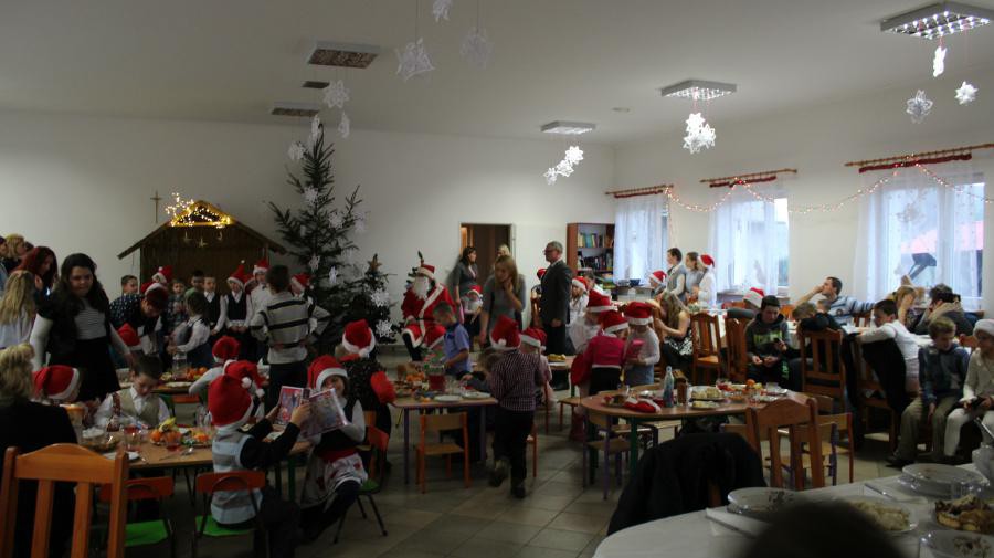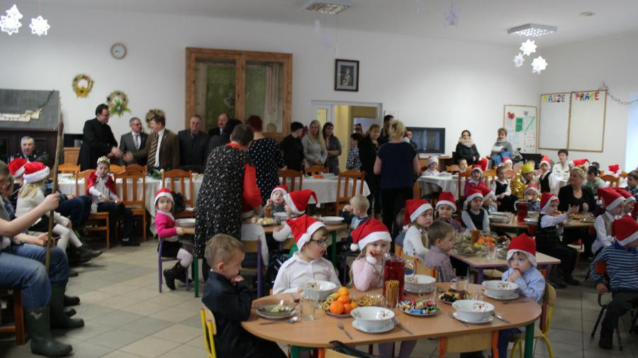 Po długo trwających i gromkich brawach dla aktorów i reżysera – jasełka bardzo się podobały – pani Paulina i pani Agnieszka przypomniały nam zwyczaje i tradycje świąteczne. Dyrektor przeczytał fragment pisma świętego o narodzeniu Jezusa i przybyciu do żłóbka pasterzy. Ksiądz proboszcz odmówił modlitwę przed wieczerzą. Podzieliliśmy się opłatkiem i zasiedliśmy do wspólnego stołu. Wieczerza była pyszna dzięki naszym rodzicom. Były uszka, pierogi z kapustą i pieczarkami, pierogi ruskie, sałatki, ryby, ciasta i napoje świąteczne. Był też barszcz gotowany w szkole na naturalnych składnikach. Byli z nami nasi Przyjaciele … Rodzice, Ks. Proboszcz, Radni Rady Gminy i Miasta Sianów pan Kazimierz Salik i pan Piotr Kłobuch, przedstawiciel OSP pan Jan Kostrzewa, pani Grażyna Gabrysiak – nasz sołtys i pan Andrzej Dębowski nasz prezes.