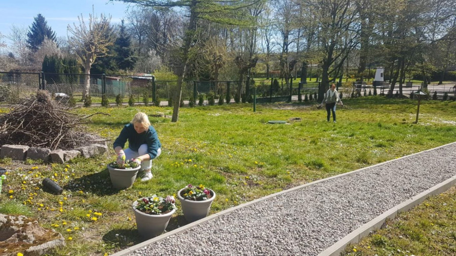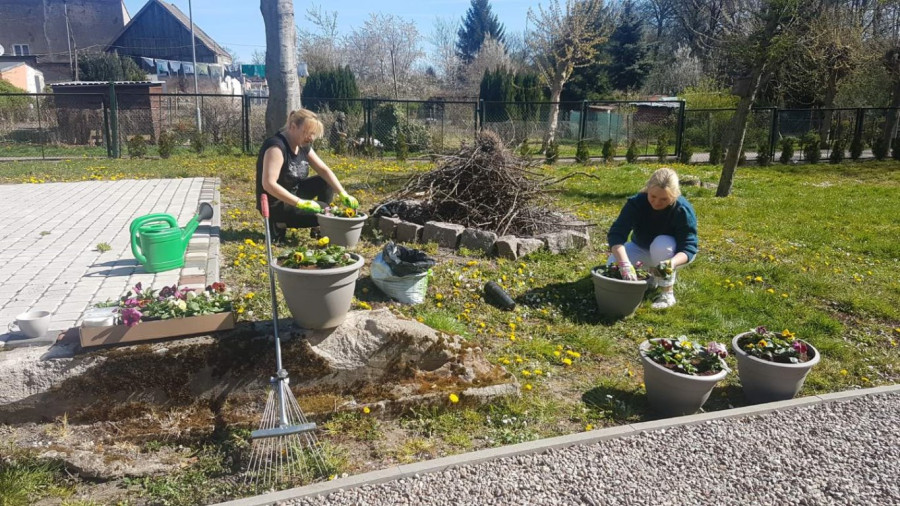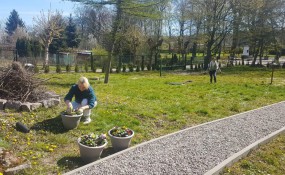 Wykorzystując przerwę w zajęciach opiekuńczo-terapeutycznych pracownicy Miejsko-Gminnego Ośrodka Pomocy Społecznej i Środowiskowego Domu Samopomocy „Szansa” w Sianowie przystąpili do porządkowania terenu wokół placówek. Po kilku tygodniach izolacji w pomieszczeniach i skupianiu się na szyciu maseczek ochrony osobistej, przyszedł czas na radosne powitanie „Pani Wiosny”. Grabienie trawy, pielenie grządek, malowanie sprzętów i sadzenie pierwszych kwiatów to podstawowe zadania, które w tym roku bez udziału domowników wykonuje personel. Chcemy, aby placówki były gotowe na ponowne uruchomienie i powrót uczestników do planowanych zajęć.