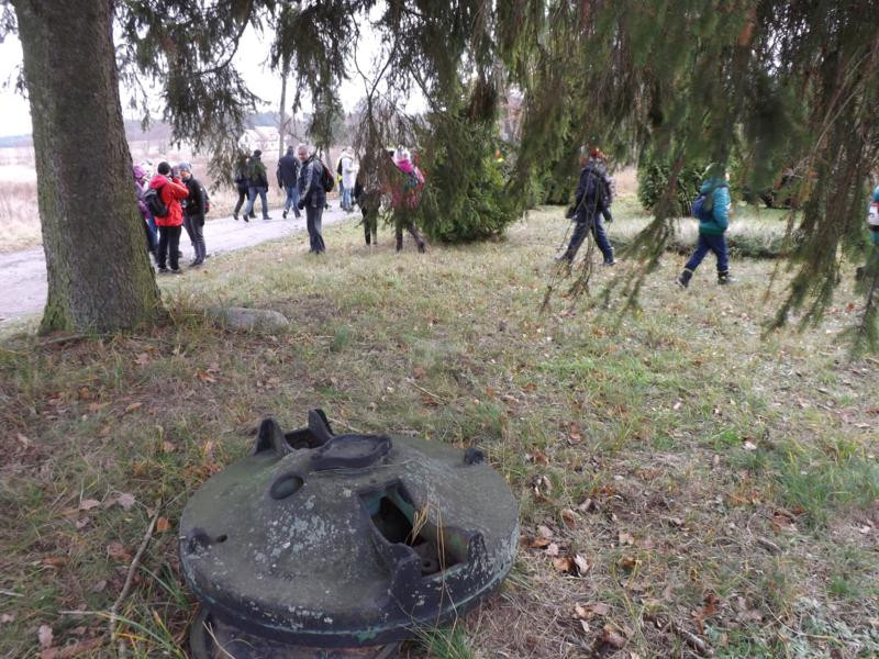 Po sprawnym namierzeniu przybliżonego miejsca ukrycia przez kol. Kazika Raczyńskiego kesz został odnaleziony a wpisy do logbooka dokonane. Idąc dalej dotarliśmy do krzyżówki szlaków, gdzie zatrzymaliśmy się przy niezwykle ciekawym urządzeniu a właściwie tym, co po nim zostało. Mowa o kieracie urządzeniu wykorzystującym siłę pociągową zwierząt (koni lub wołów) do napędu stacjonarnych maszyn rolniczych takich jak sieczkarnia, wialnia czy młocarnia, bądź do wydobywania wody. To, co mogliśmy zobaczyć to jedno z kół, gdyż kierat to zespół przekładni zębatych, najczęściej składający się z dwóch par kół, przymocowany do ramy. Największe z kół było połączone z dyszlem służącym do zaprzęgania zwierząt pociągowych.