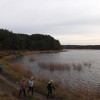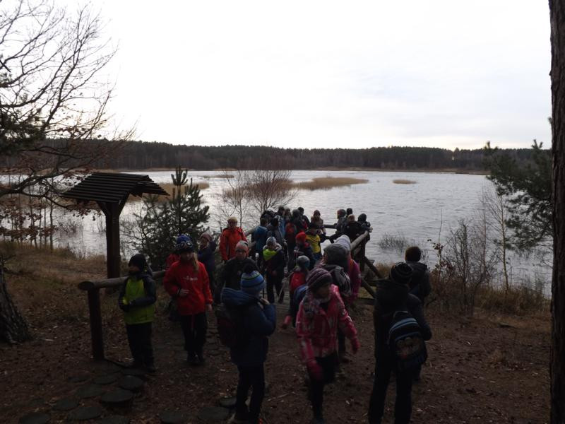 Zwierzęta obracały przekładnię chodząc po okręgu o średnicy ok. 10 m. Napęd z kieratu do maszyn stojących w odległości kilkunastu metrów przekazywany był za pomocą wału. Wał składał się z kilku odcinków połączonych przegubami. Po tym, krótkim przybliżeniu napotkanej ciekawostki grupa wyruszyła w dalszą drogę, a do akcji znów ruszyli geocachingowcy. Sprawny namiar SPS-em i już kolejny keszyk w naszych rękach. Wędrując dalej i podziwiając sianowskie lasy dotarliśmy wreszcie do celu naszego rajdu, czyli użytku ekologicznego „Jezioro Topiele”. Tu nad jeziorem kilka słów o tym bardzo ciekawym i złożonym ekosystemie opowiedział kolega Marcin Kruszczyński.