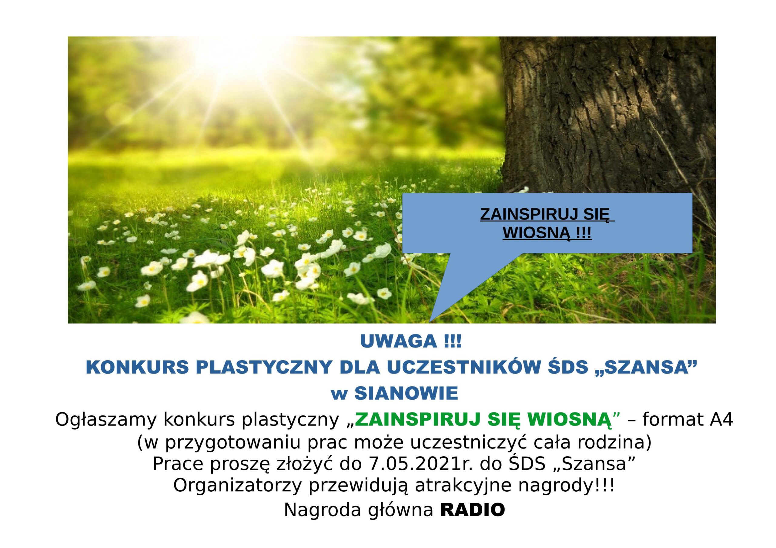 Wszyscy z utęsknieniem czekamy na wiosnę, co prawda mamy już kalendarzową, ale za oknem jeszcze jej tak całkiem nie widać i jak na złość wcale się do nas nie śpieszy. Aby kiepska aura nie psuła nam nastroju uczestnicy Środowiskowego Domu Samopomocy „Szansa” wezmą udział w konkursie plastycznym pt. ,,Zainspiruj się wiosną” dowolną techniką . Naszym zamysłem jest by każdy uczestnik pobudził swoją wyobraźnie i choć trochę zainspirował się ciepłą wiosną, na którą wszyscy czekamy. Dla wszystkich uczestników przewidujemy nagrody ...