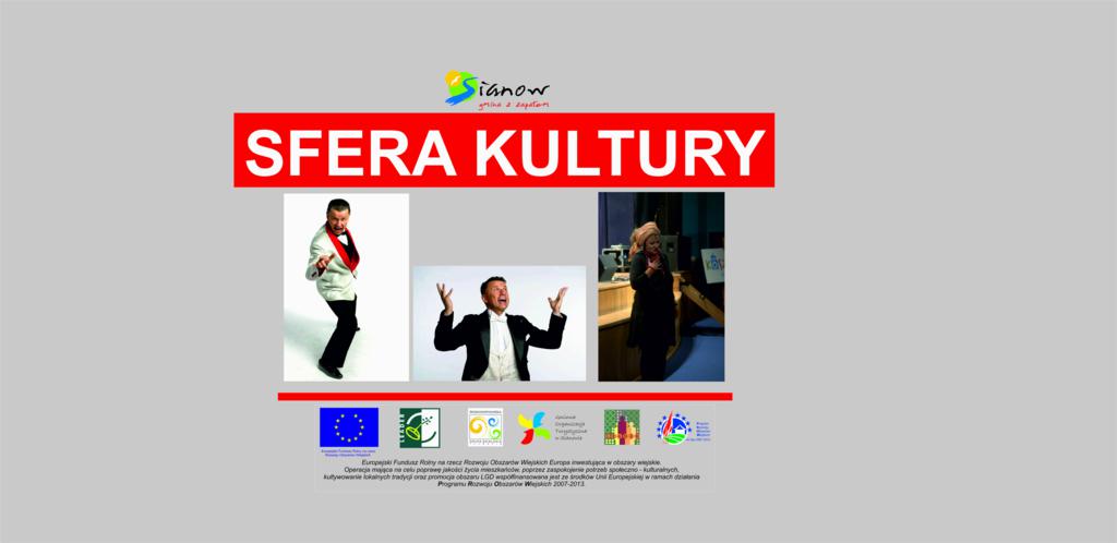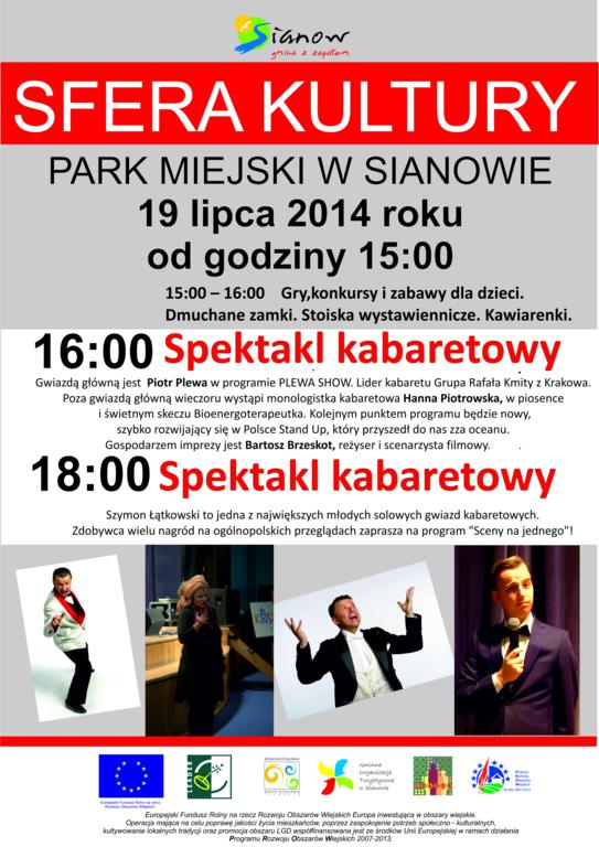 19 lipca o godzinie 15:00 w Parku Miejskim w Sianowie odbędzie się Sfera Kultury, Gwiazda główna jest Piotr Plewa – lider kabaretu Grupa Rafała Kmity z Krakowa. Poza gwiazda wieczoru wystąpi monologistka kabaretowa Hanna Piotrowska, w piosence i świetnym skeczu Bioenergoterapeutka. Kolejnym punktem programu będzie nowy, szybko rozwijający się w Polsce Stand Up, który przyszedł do nas zza oceanu. Gospodarzem imprezy jest Bartosz Brzeskot, reżyser i scenarzysta filmowy.