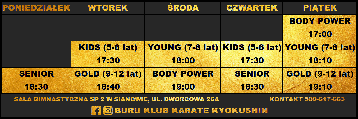 BURU Klub Karate Kyokushin zaprasza na zajęcia we wszystkich grupach wiekowych, które odbywają się w Szkole Podstawowej nr 2 w Sianowie, ul. Dworcowa 26A: