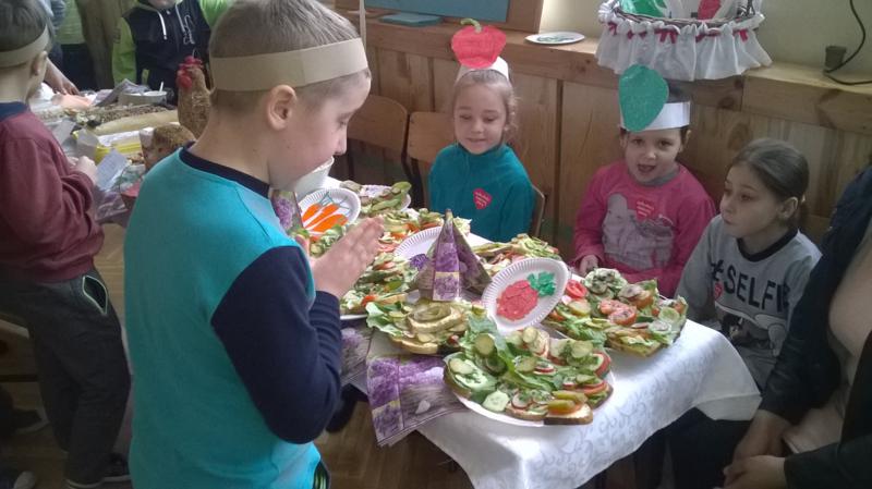 Tego dnia odbył się w szkole konkurs pod nazwą „Jedz owoce i jarzyny, bo są źródłem witaminy”, który był częścią projektu gimnazjalnego uczniów z klasy II gimnazjum pod opieką pani Jolanty Prokopiak-Sali. Każda klasa przygotowała stoiska z potrawami służącymi zdrowiu i zapraszała do degustacji za drobną opłatą przeznaczoną na WOŚP. Uczniowie wykazali się pomysłowością i zaangażowaniem. Stoły uginały się pod ciężarem różnorodnych dań, a gazetki i prozdrowotne hasła przyciągały wzrok. Ponadto każdy mógł zakupić za niewielką opłatą los na loterii fantowej, pomalować twarz, zrobić fryzurę, tatuaż wodny lub znaleźć coś dla siebie na stoisku z wyprzedażą rzeczy niepotrzebnych.